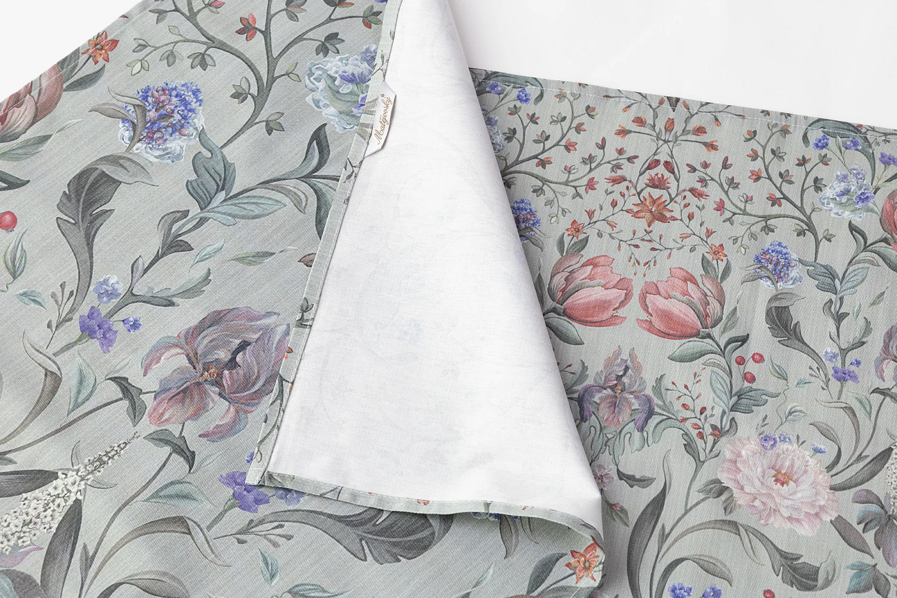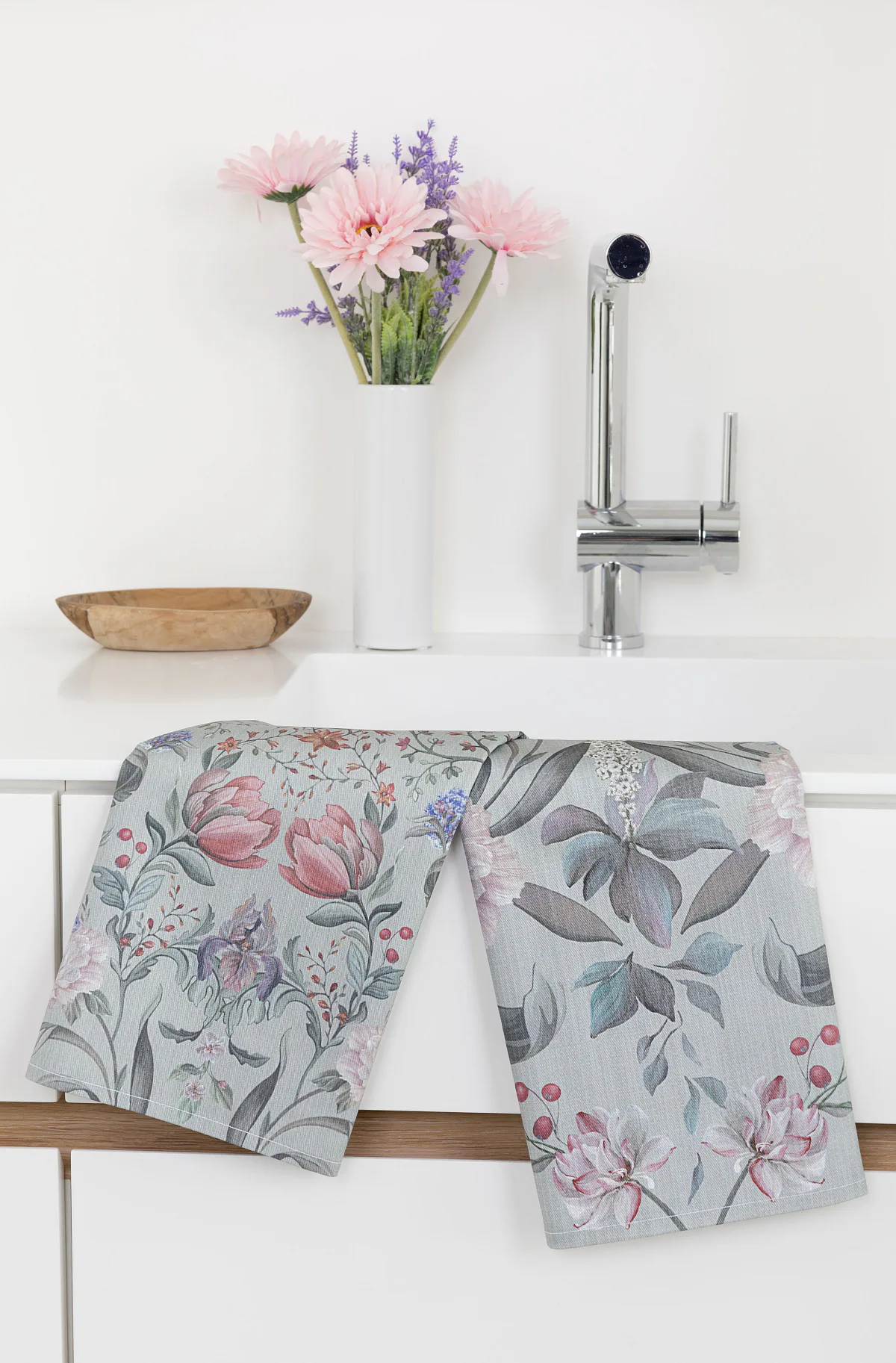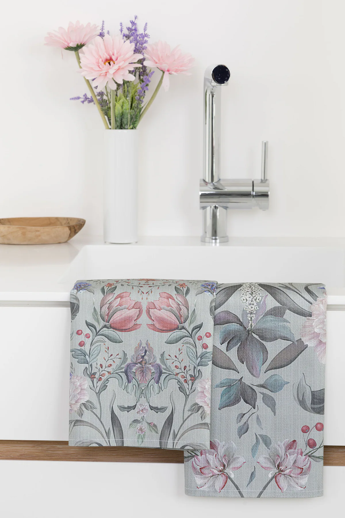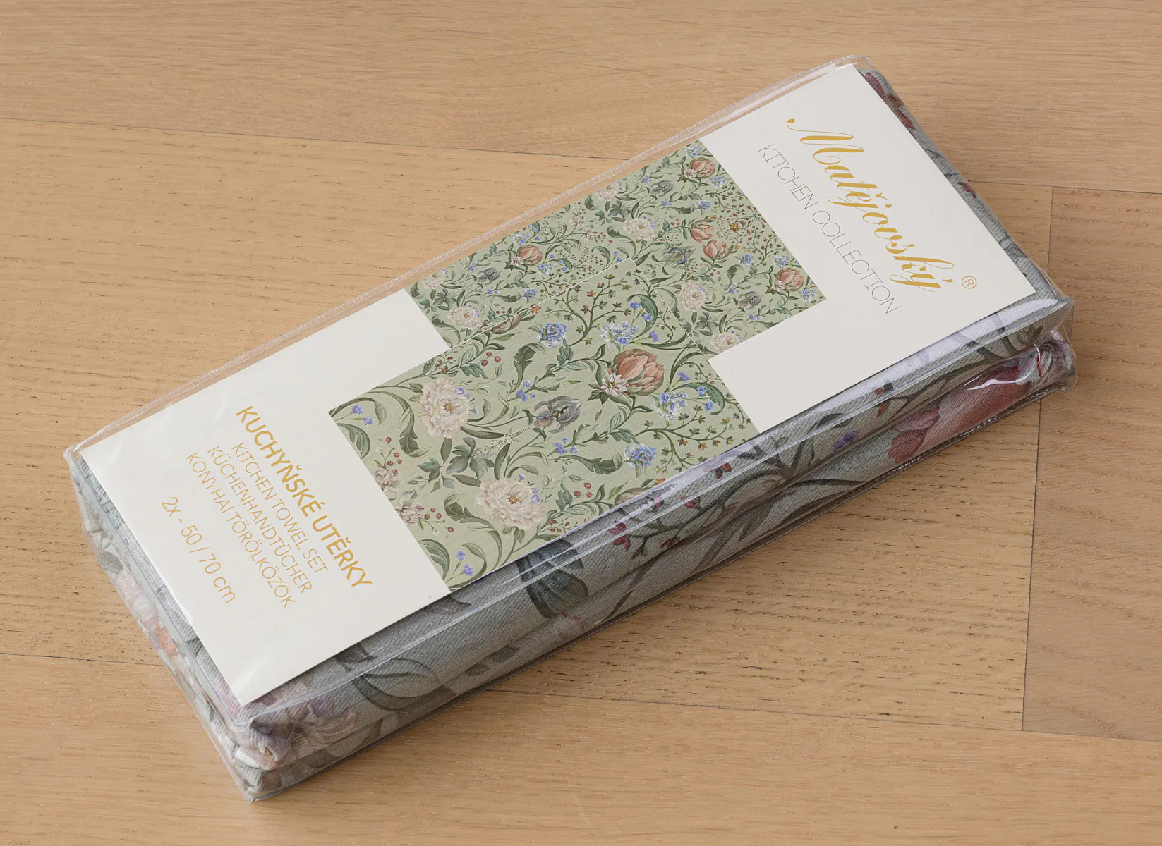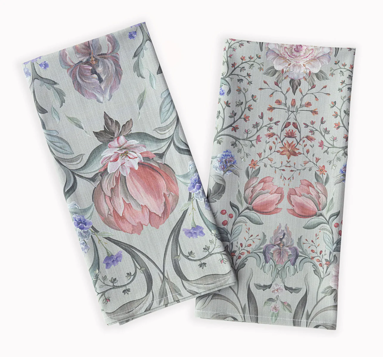 Potisk: jednostranný, obě utěrky zachycují stejný florální motiv s odlišnou velikostí květin