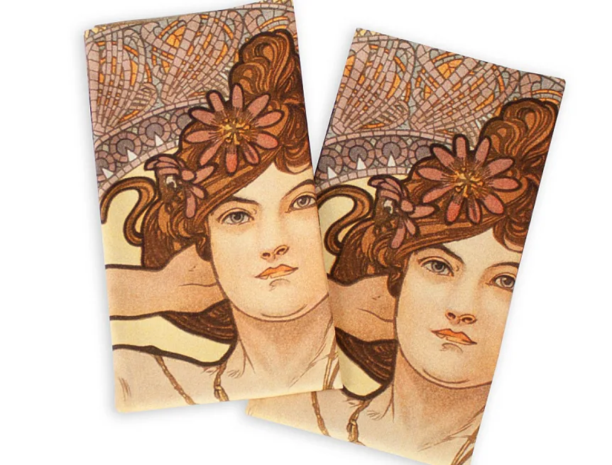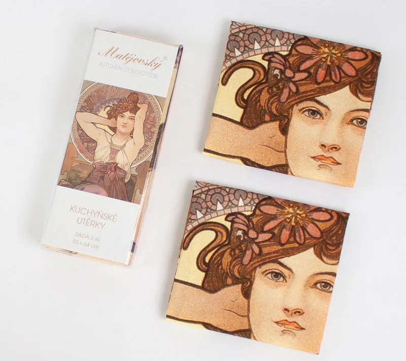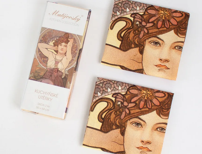 Kolekce bavlněných kuchyňských utěrek s kresbami Alfonse Muchy vnese do vaší kuchyně jediněčnou atmosféru. Nejmodernější digitální tisková technologie zajišťuje zářivé barvy a precizní detaily.