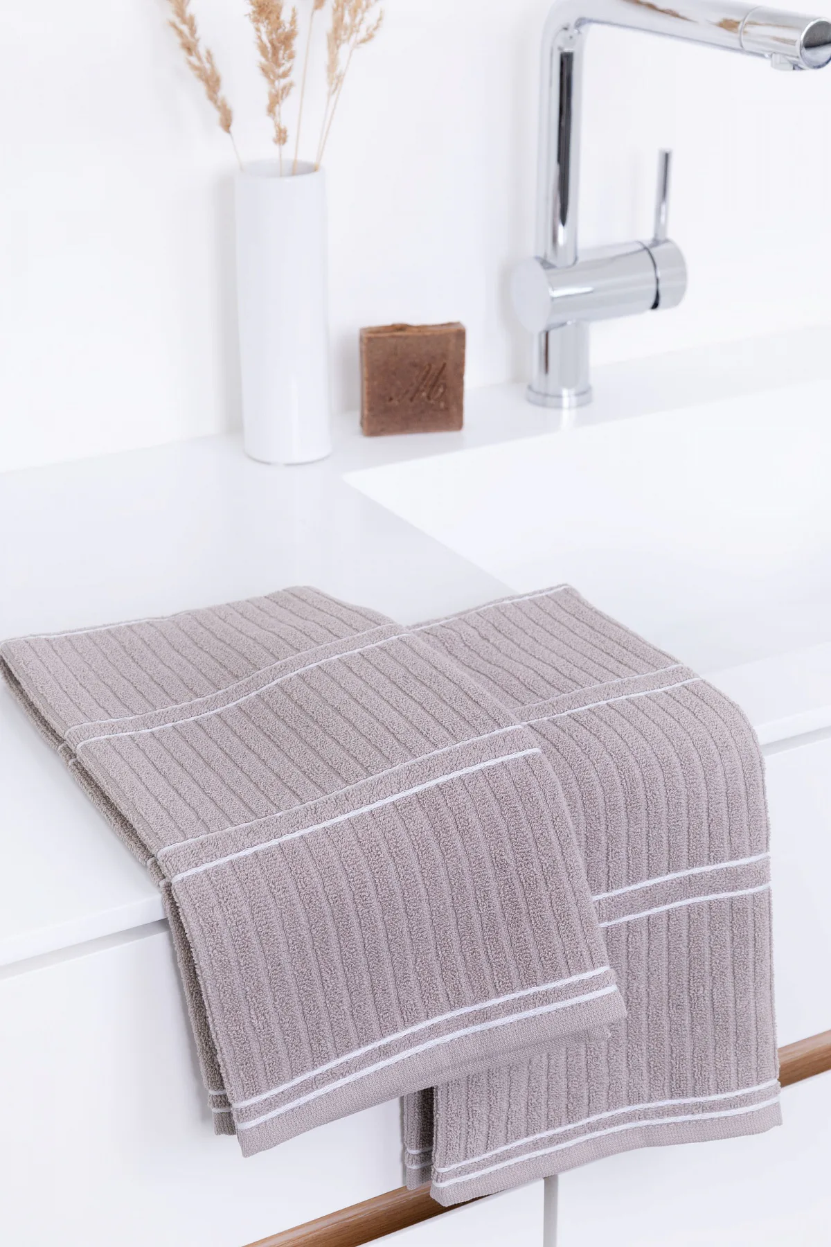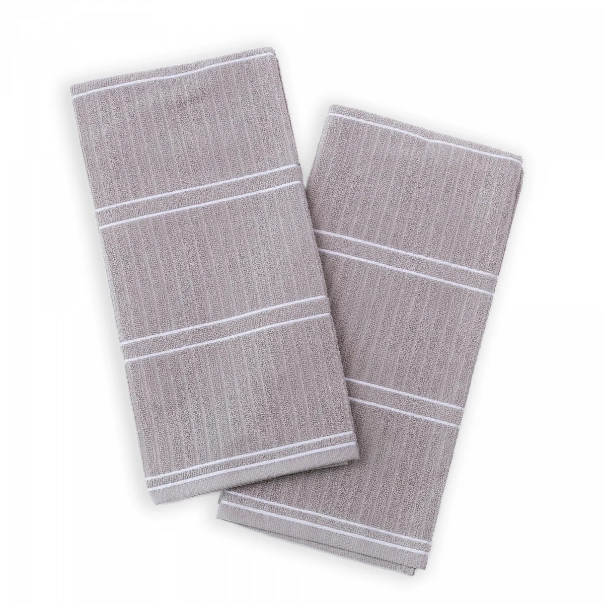 Kuchyňské utěrky Arona upoutají vaši pozornost moderním designem - vytkaný proužkovaný vzor vyniká na lícové straně smyčkového froté. Spodní stranu utěrky tvoří odlehčené froté v inverzním provedení. Originální design utěrek podtrhuje vodorovně vyšitá bílá linka. Utěrky jsou navrženy tak, aby měly ideální absorpční vlastnosti a současně rychle schly. Utěrky jsou ze všech čtyř stran lemované a jsou opatřeny praktickým poutkem.