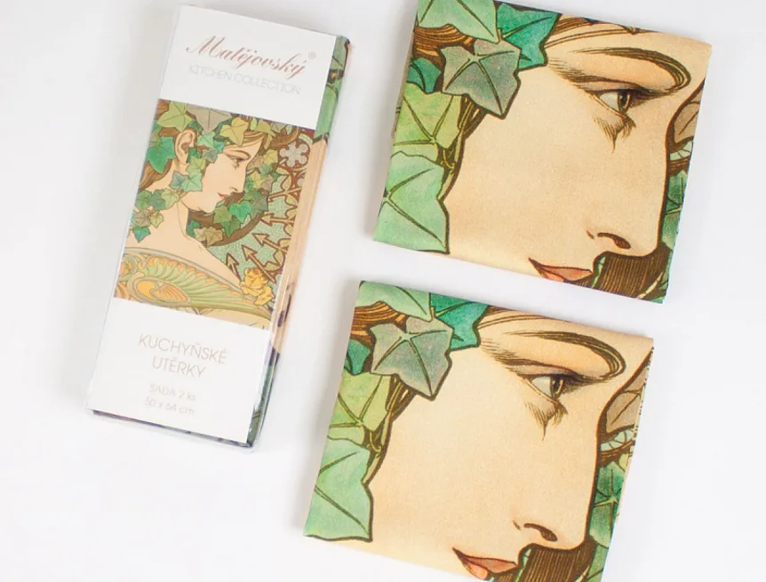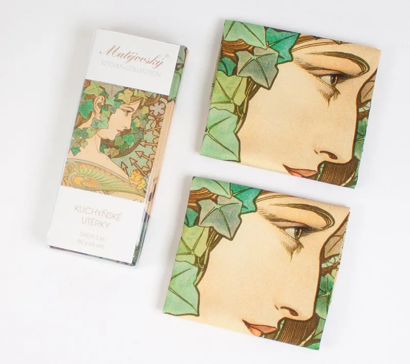Kolekce bavlněných kuchyňských utěrek s kresbami Alfonse Muchy vnese do vaší kuchyně jediněčnou atmosféru. Nejmodernější digitální tisková technologie zajišťuje zářivé barvy a precizní detaily.