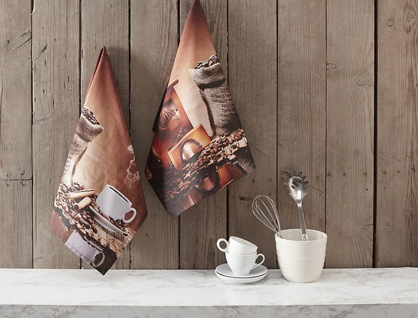 Nová exkluzivní kolekce designových kuchyňských utěrek přináší oblíbený vzor COFFEE. Motiv lahodné vonící kávy osvěží každý moderní interiér kuchyně.
