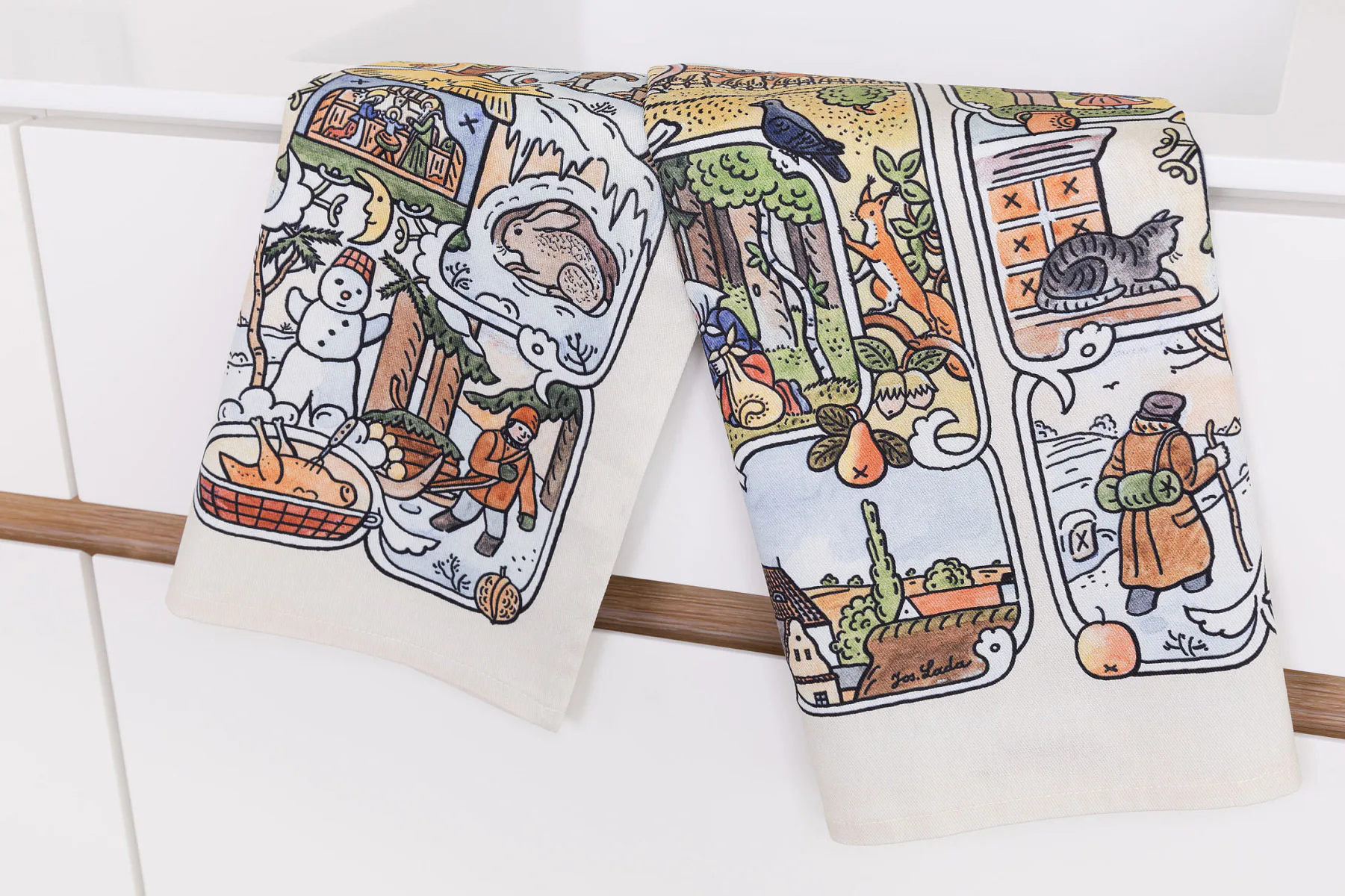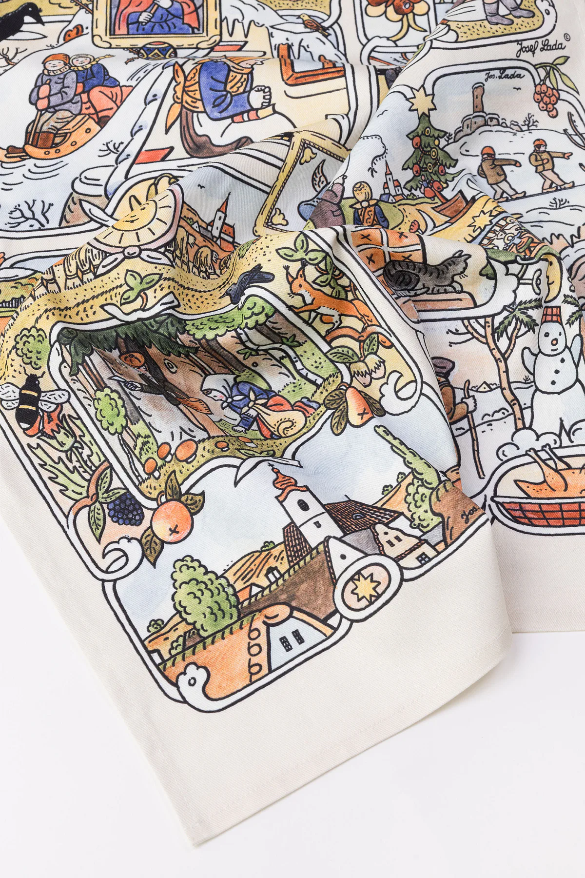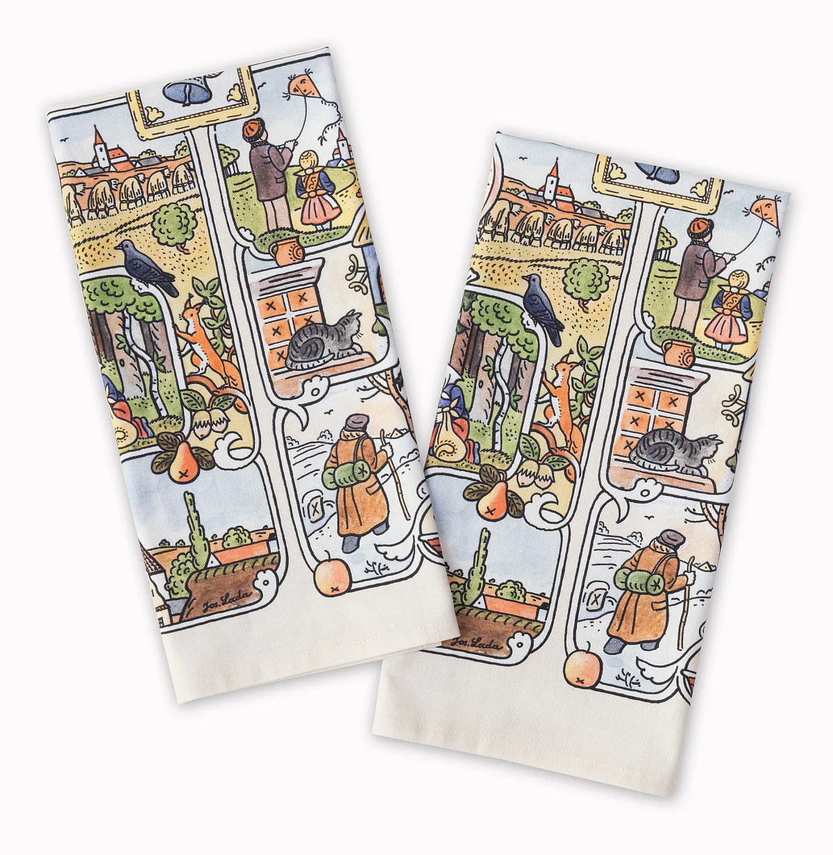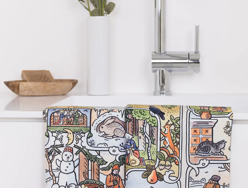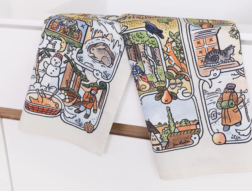 Kuchyňské utěrky Čtyři roční období se díky nejmodernější digitální tiskové technologii pyšní nádhernými barvami a precizními detaily, které vykreslují autentickou ladovskou poetiku.