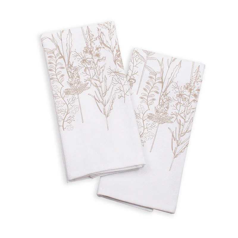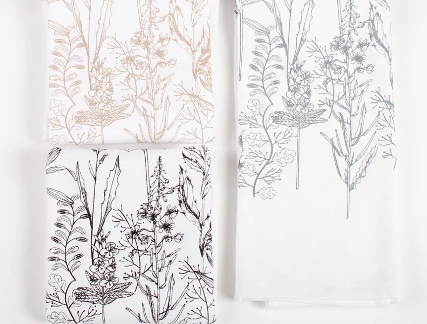 Kuchyňské utěrky Herbář si vás získají svým praktickým provedením i moderním vzorem. Luční kvítí je vykresleno v jemných béžových linkách. Vrchní potištěná strana je hladká s jemnou vlnkovou strukturou, spodní stranu tvoří hebké bílé froté. Utěrky mají všechny čtyři strany lemované a jsou opatřeny praktickým poutkem pro zavěšení.