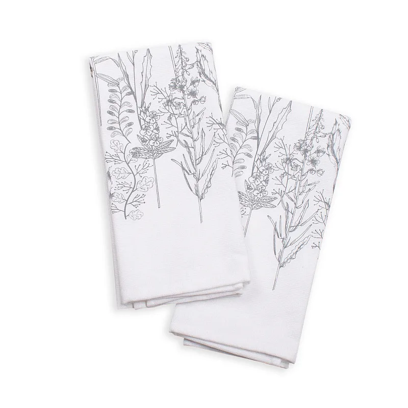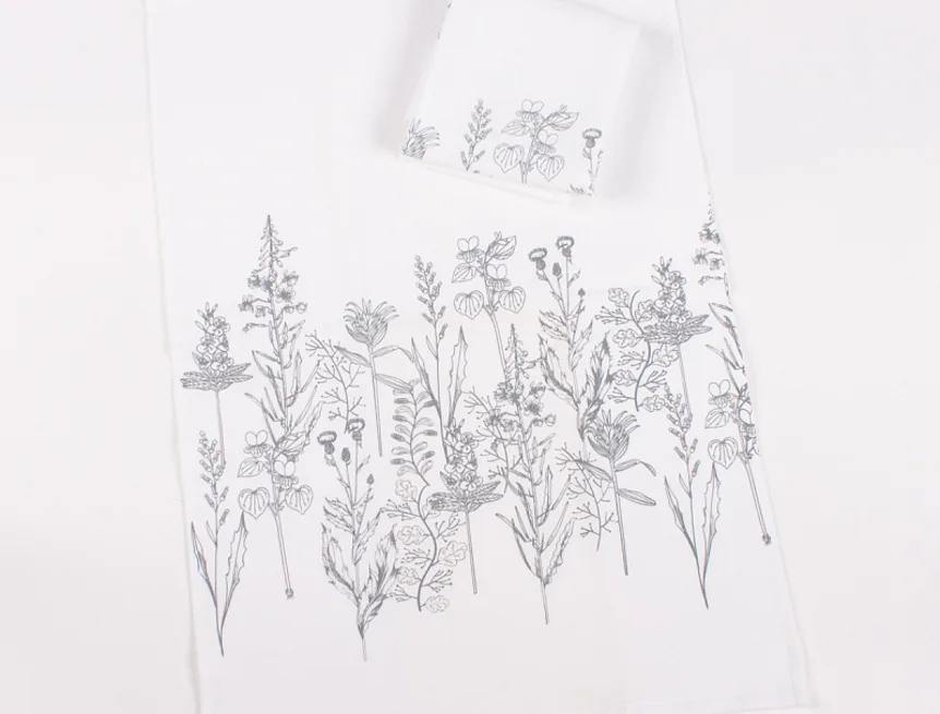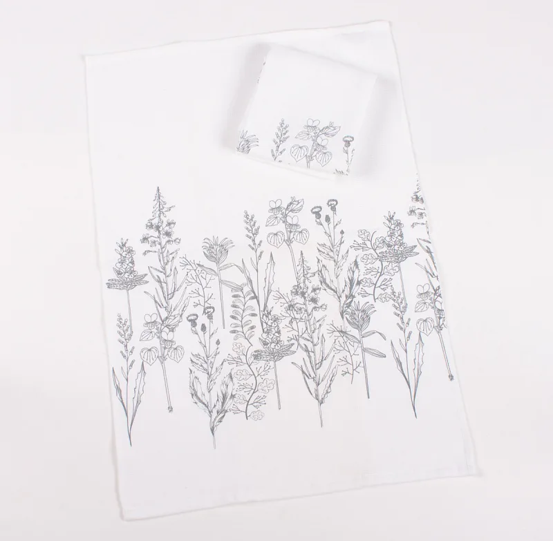 Kuchyňské utěrky Herbář si vás získají svým praktickým provedením i moderním vzorem. Luční kvítí je vykresleno v jemných šedých linkách. Vrchní potištěná strana je hladká s jemnou vlnkovou strukturou, spodní stranu tvoří hebké bílé froté. Utěrky mají všechny čtyři strany lemované a jsou opatřeny praktickým poutkem pro zavěšení.