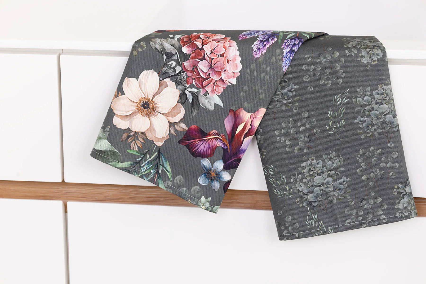 Potisk: jednostranný, obě utěrky zachycují jinak zpracovaný květinový motiv na zelenošedém podkladu