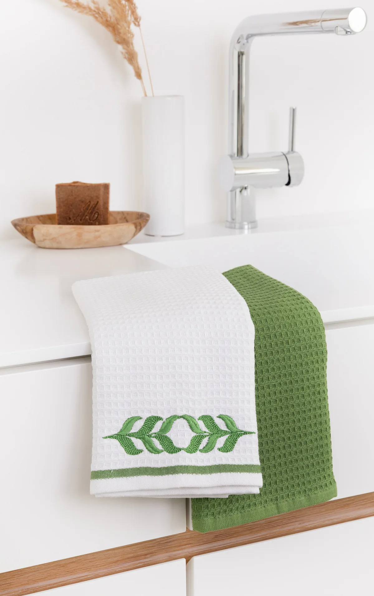 • 1x bílá utěrka s výšivkou a zelenou bordurou