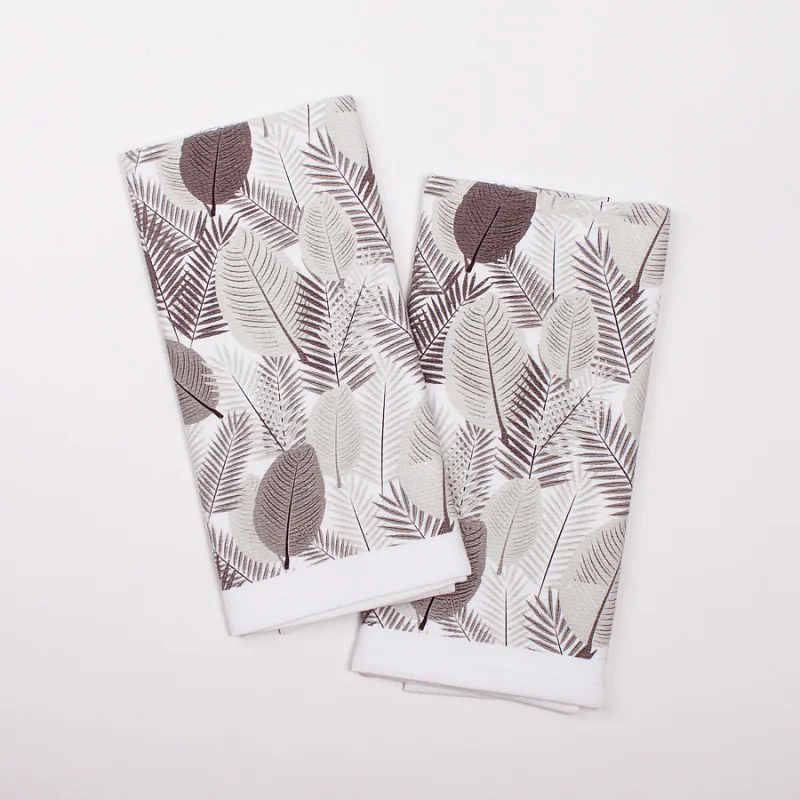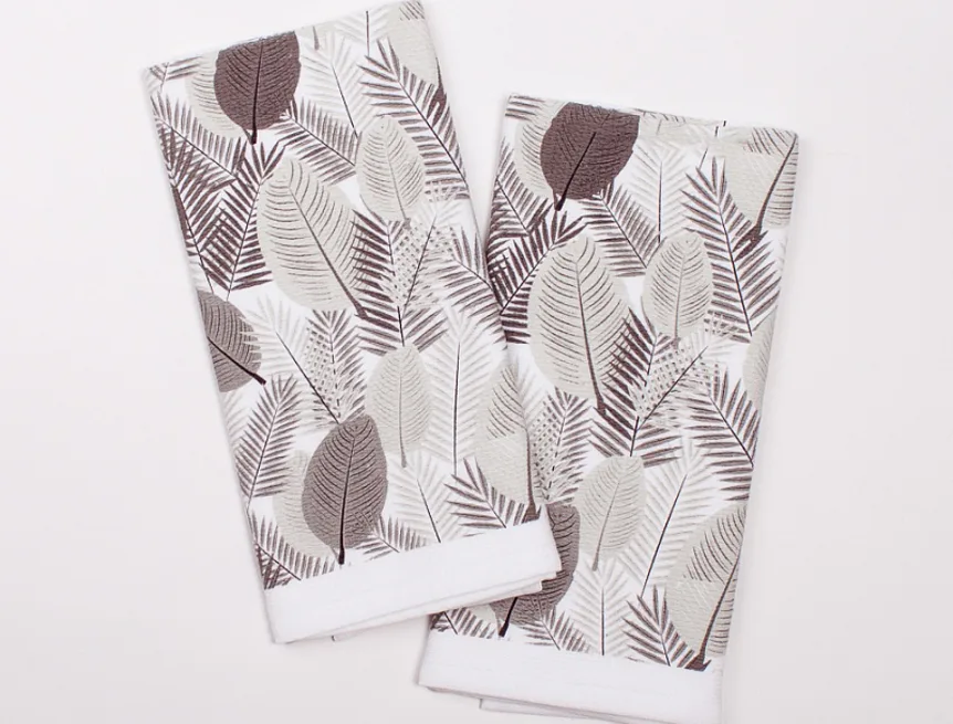 Kuchyňské utěrky jsou zajímavé svým praktickým provedením. Vrchní strana je hladká s jemnou vlnkovou strukturou, spodní stranu tvoří hebké bílé froté. Černobílá verze nejrůznějších tropických listů nenápadně doplní každý moderní interiér kuchyně. Utěrky mají všechny čtyři strany lemované a jsou opatřeny praktickým poutkem pro zavěšení.