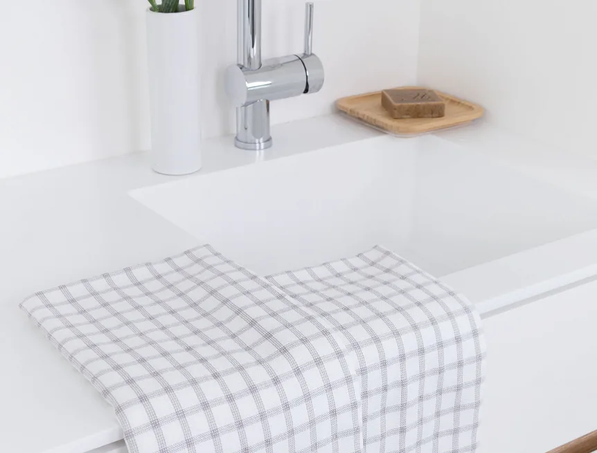 Kuchyňské utěrky Kostky vynikají svým praktickým provedením a nadčasovým designem. Vrchní strana utěrky je hladká s jednoduchým kostkovaným vzorem, spodní stranu tvoří hebké bílé froté s prosvítajícím motivem kostek z vrchní strany. Díky optimální gramáži utěrky výborně sají a velmi rychle schnou. Utěrky mají všechny čtyři strany lemované a jsou opatřeny praktickým poutkem.
