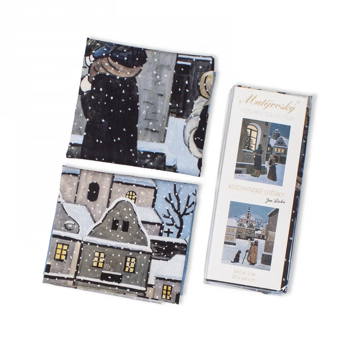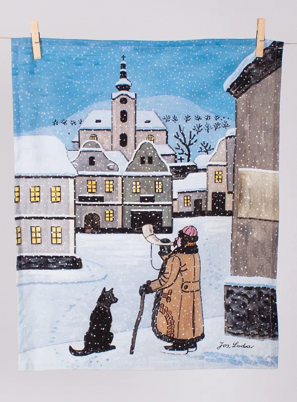 Kuchyňské utěrky Ladovská zima s motivy obrázků Okno se stromkem a Ponocný se díky nejmodernější digitální tiskové technologii pyšní nádhernými barvami a precizními detaily, které vykreslují autentickou ladovskou poetiku.