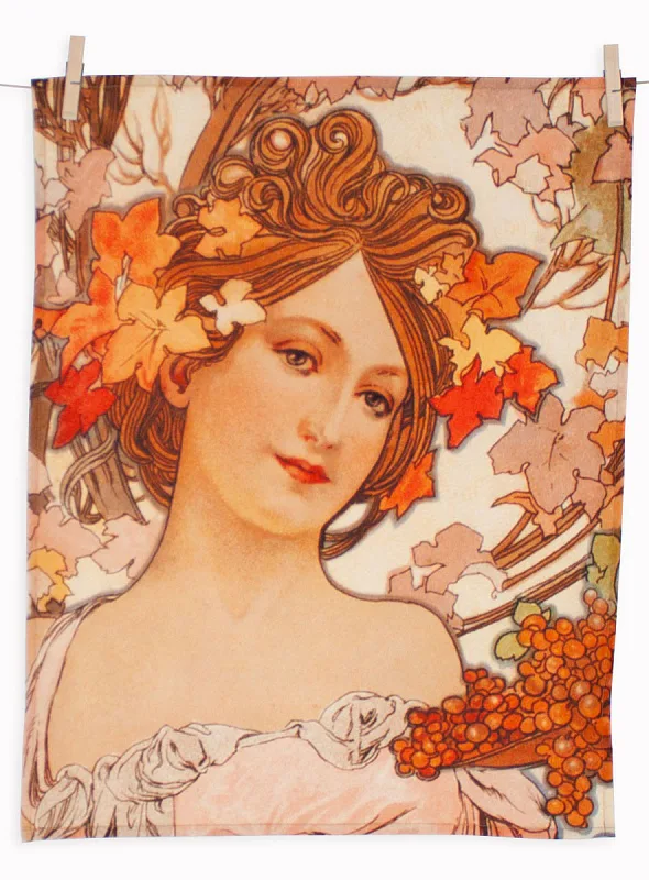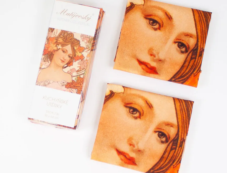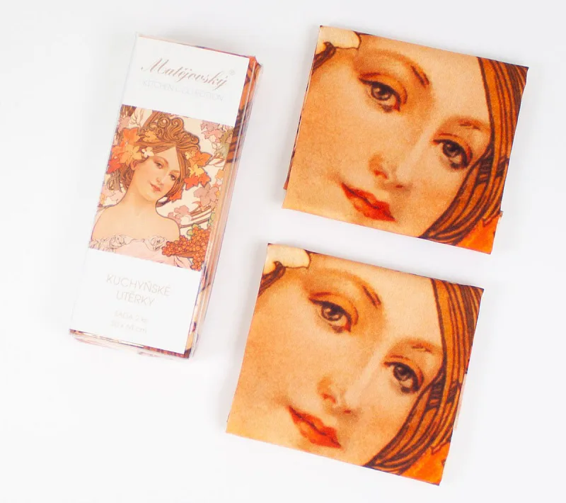 Kolekce bavlněných kuchyňských utěrek s kresbami Alfonse Muchy vnese do vaší kuchyně jediněčnou atmosféru. Nejmodernější digitální tisková technologie zajišťuje zářivé barvy a precizní detaily.