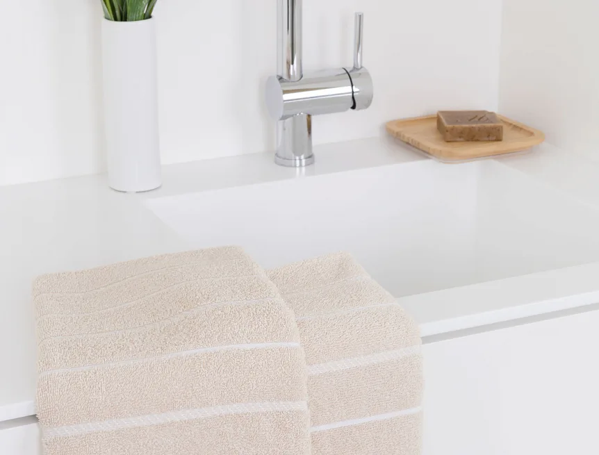 Kuchyňské utěrky Mona zdobí na vrchní straně smyčkového froté elegantní bílé proužky, na spodní straně utěrky jsou tyto proužky v barvě froté. Utěrky jsou navrženy tak, aby měly ideální absorpční vlastnosti a současně rychle schly. Utěrky jsou ze všech čtyř stran lemované a jsou opatřeny praktickým poutkem.