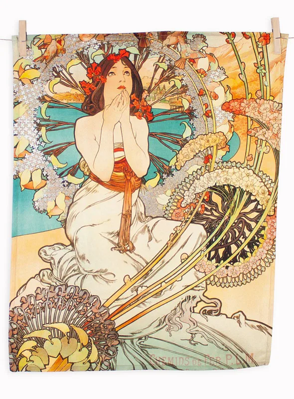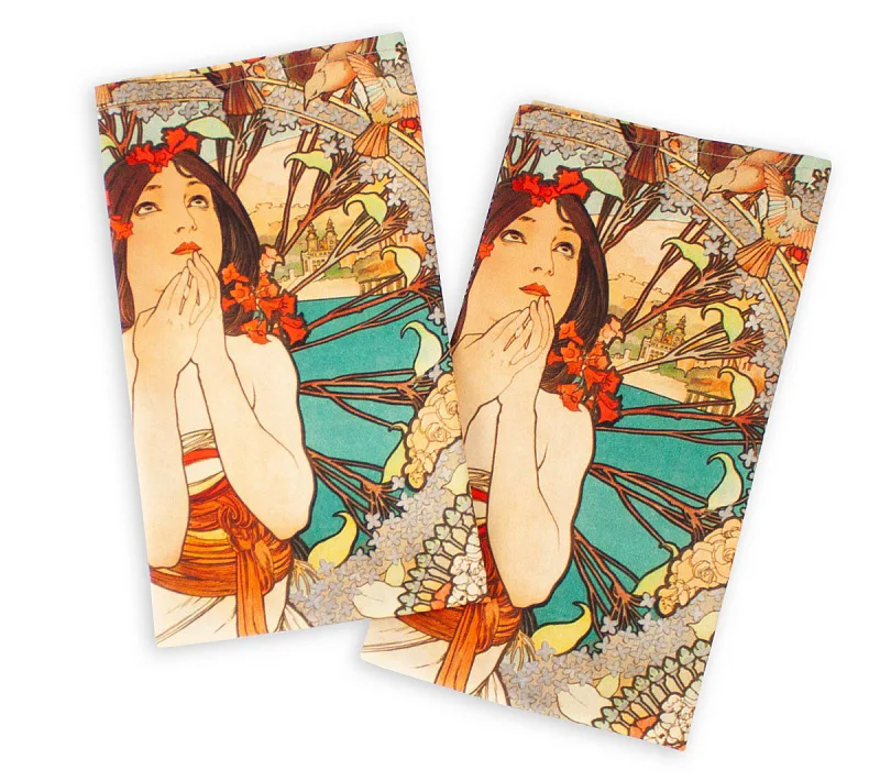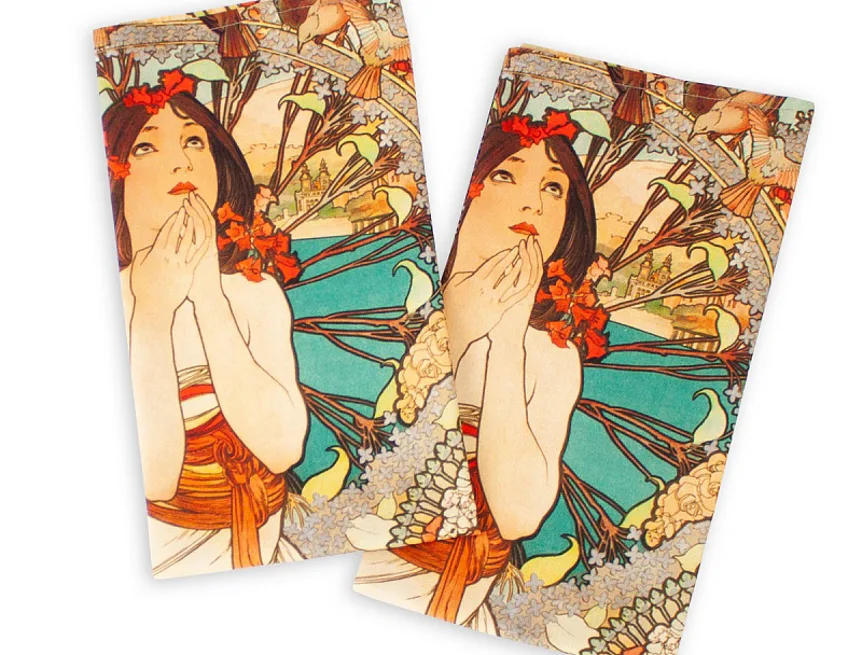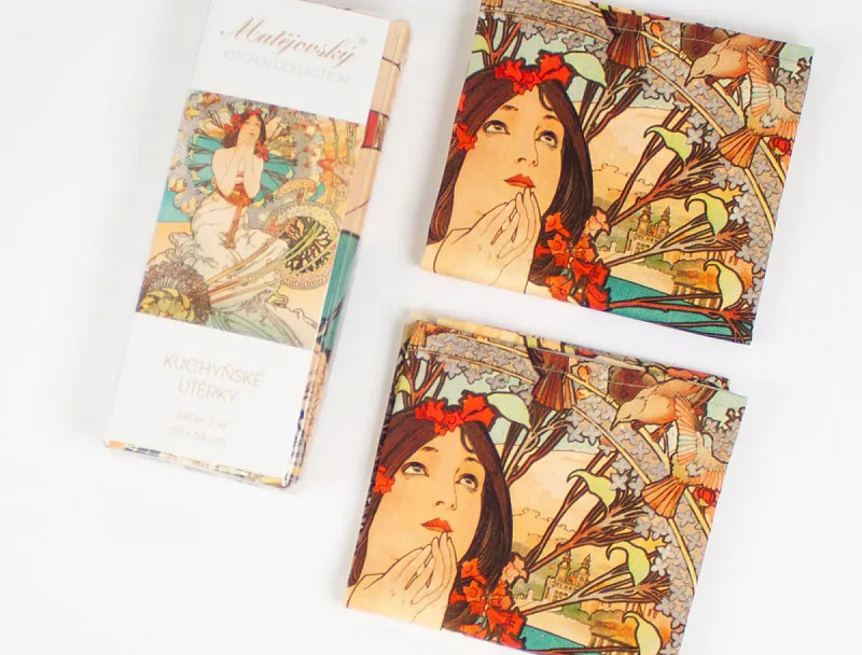Kolekce bavlněných kuchyňských utěrek s kresbami Alfonse Muchy vnese do vaší kuchyně jediněčnou atmosféru. Nejmodernější digitální tisková technologie zajišťuje zářivé barvy a precizní detaily.