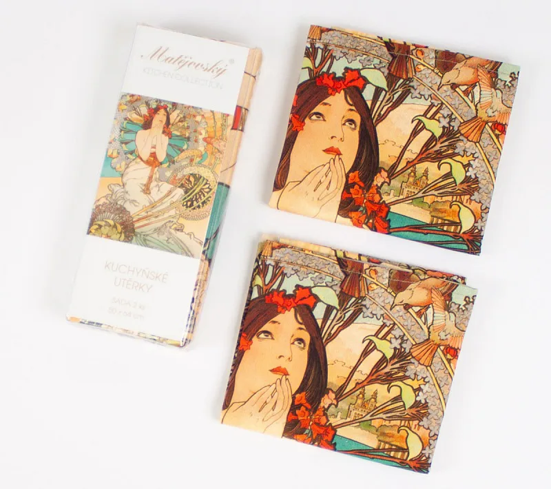 Kolekce bavlněných kuchyňských utěrek s kresbami Alfonse Muchy vnese do vaší kuchyně jediněčnou atmosféru. Nejmodernější digitální tisková technologie zajišťuje zářivé barvy a precizní detaily.