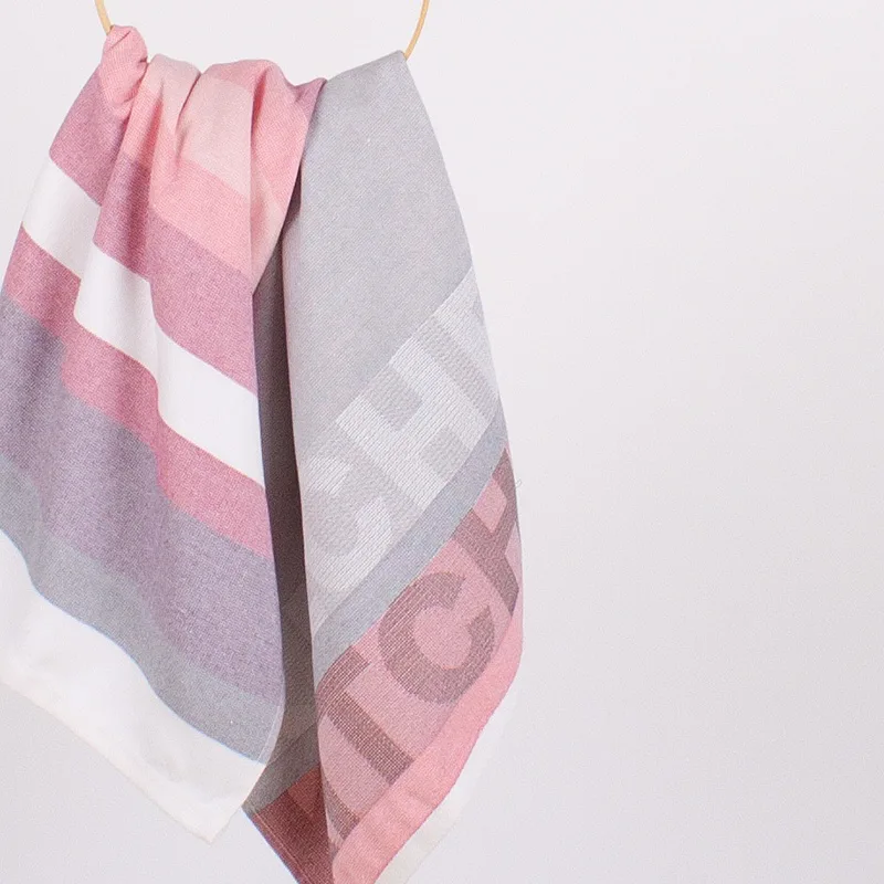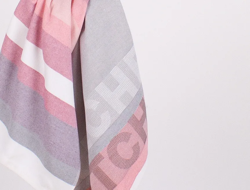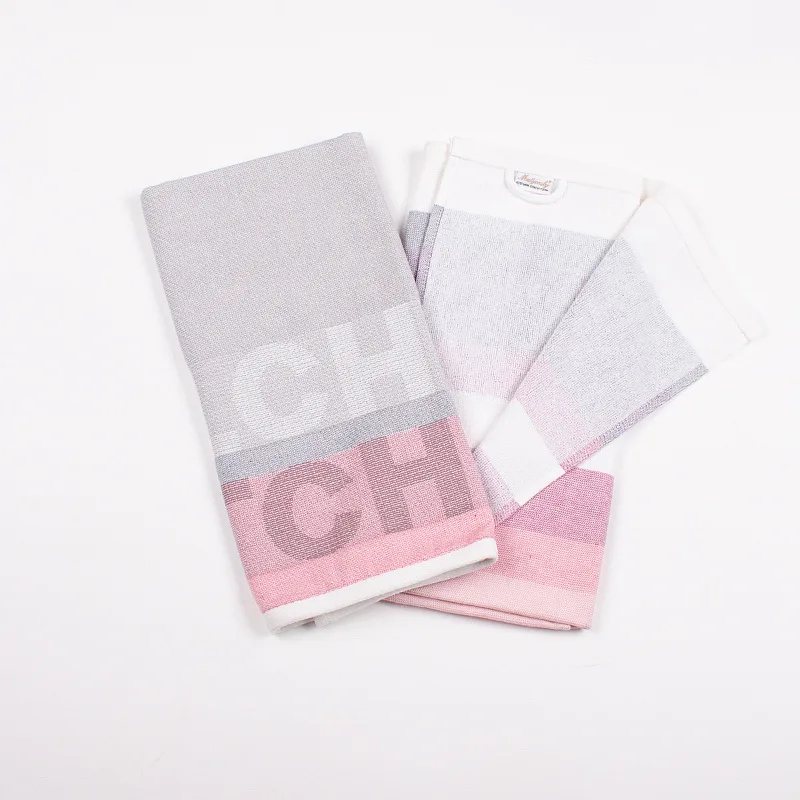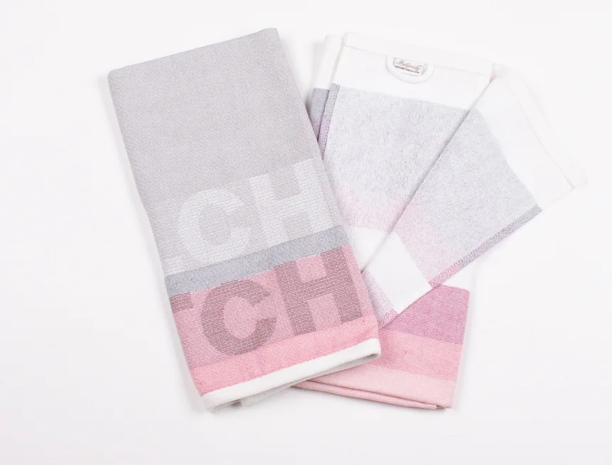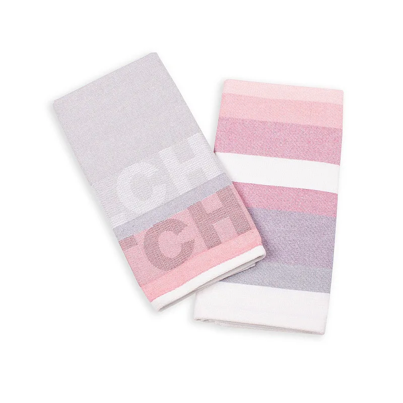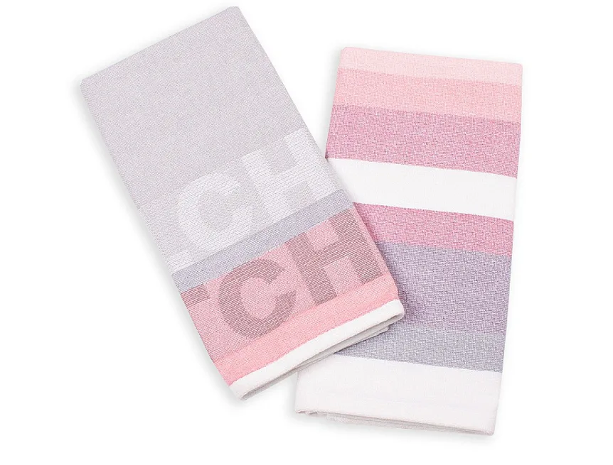 Kuchyňské utěrky Siesta vynikají svým praktickým provedením a moderním designem. Základní barvu tvoří tóny šedé doplněné o odstíny růžové a fialové.Vrchní strana utěrky je hladká s jemnou vlnkovou strukturou, spodní stranu tvoří hebké bílé froté. Jednu z utěrek charakterizuje decentní pruhovaný vzor, na druhé vás na první pohled zaujme vytkaný nápis Kitchen. Utěrky mají všechny čtyři strany lemované a jsou opatřeny praktickým poutkem pro zavěšení.