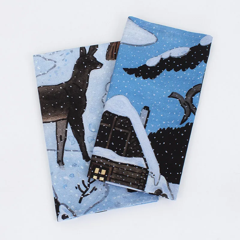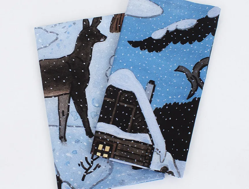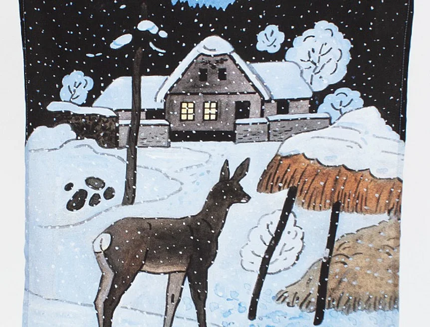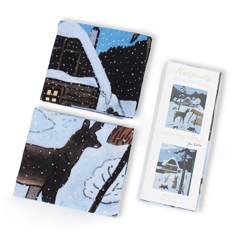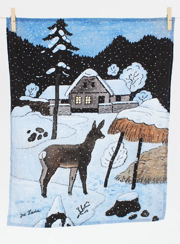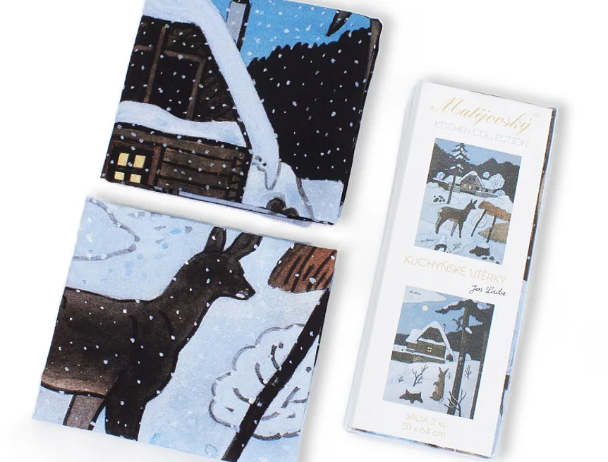 Kuchyňské utěrky Srnka & Zajíc se díky nejmodernější digitální tiskové technologii pyšní nádhernými barvami a precizními detaily, které vykreslují autentickou ladovskou poetiku.