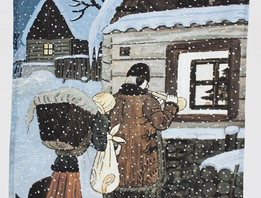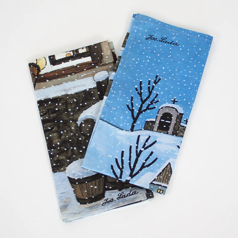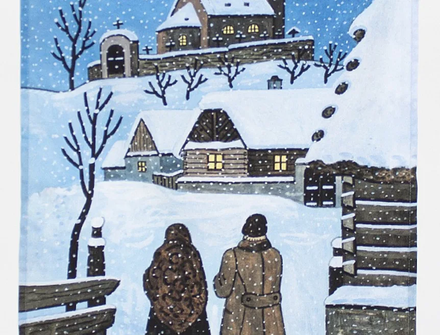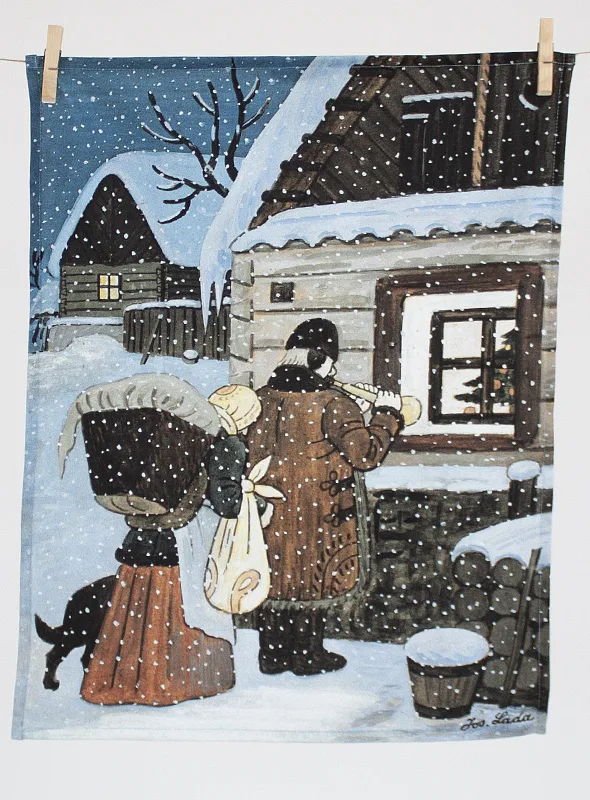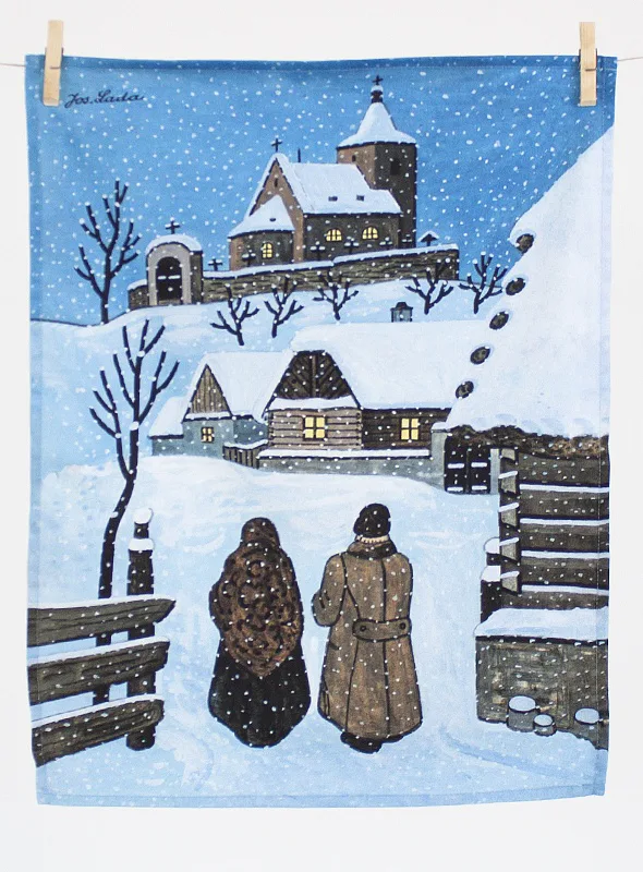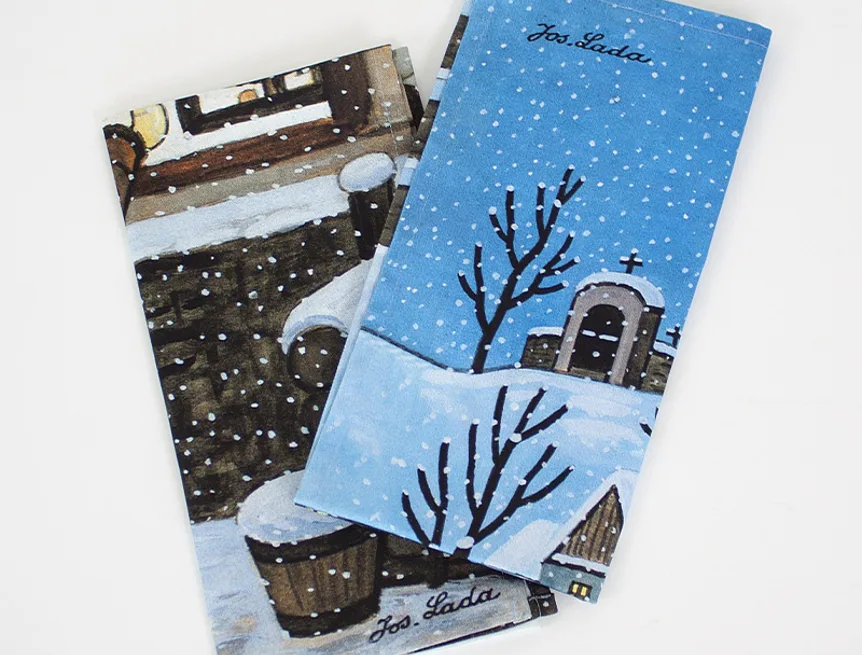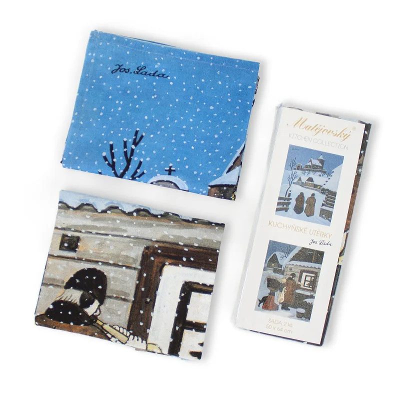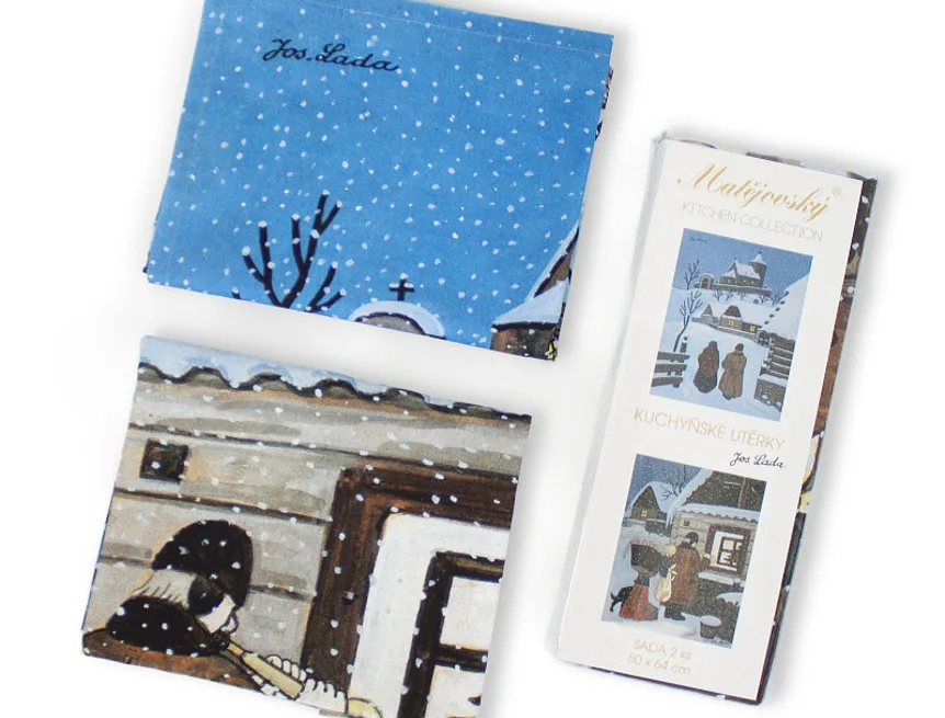 Kuchyňské utěrky Štědrý večer s motivy obrázků Slouha a Na půlnoční se díky nejmodernější digitální tiskové technologii pyšní nádhernými barvami a precizními detaily, které vykreslují autentickou ladovskou poetiku.