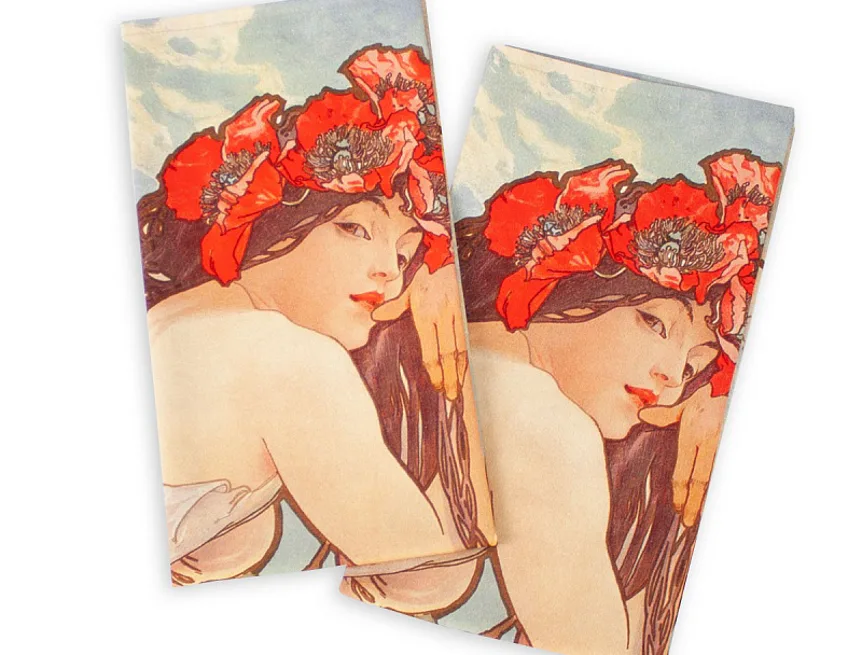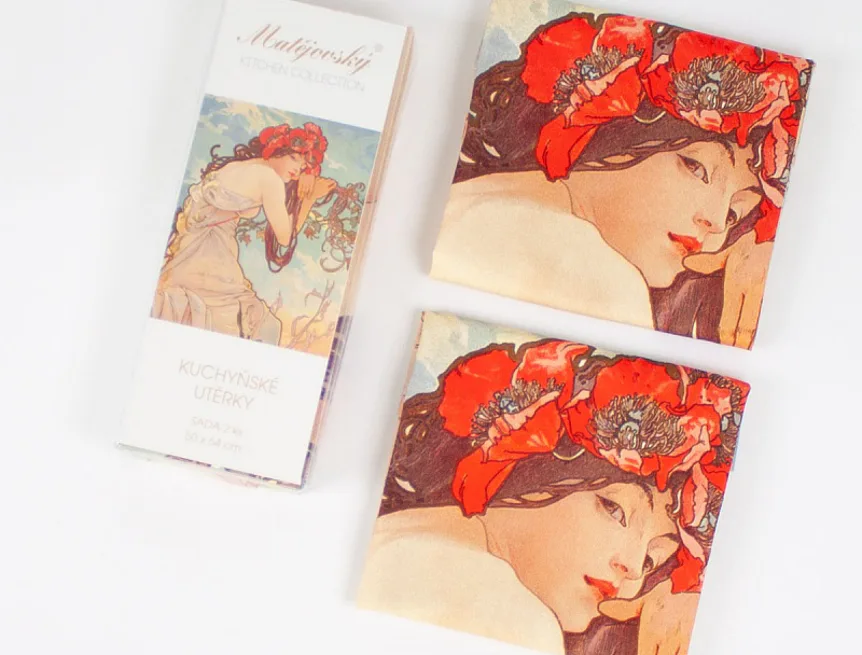 Kolekce bavlněných kuchyňských utěrek s kresbami Alfonse Muchy vnese do vaší kuchyně jediněčnou atmosféru. Nejmodernější digitální tisková technologie zajišťuje zářivé barvy a precizní detaily.