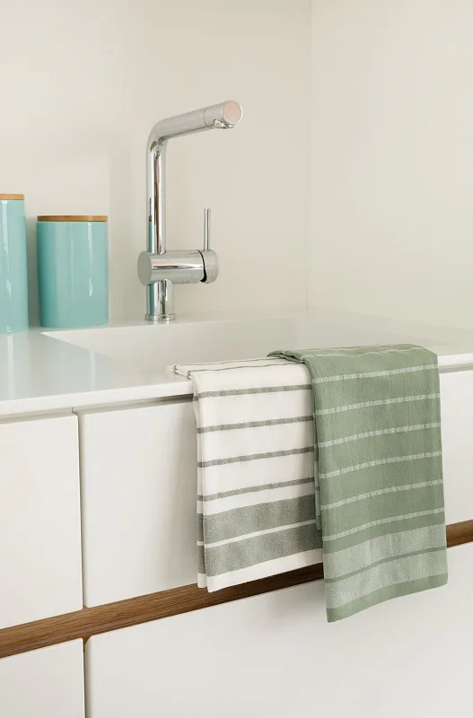 Tradiční design v kombinaci s moderními pastelovými barvami činí z kolekce bavlněných utěrek Tiny skvělé pomocníky do každé kuchyně. Utěrky mají všechny čtyři strany lemované a jsou opatřeny praktickým poutkem pro zavěšení.