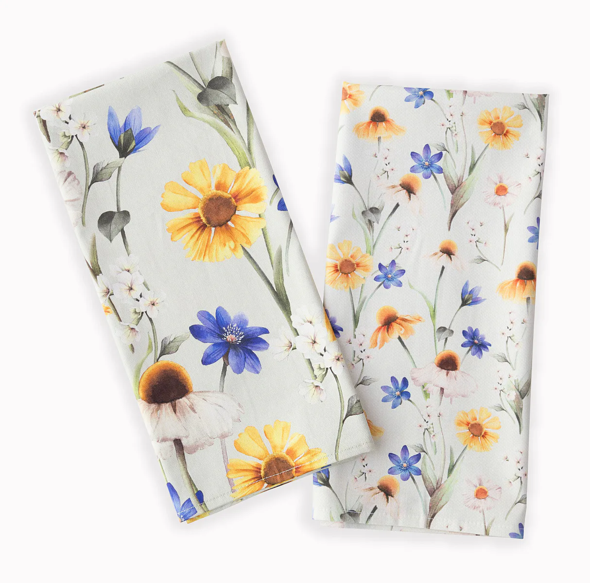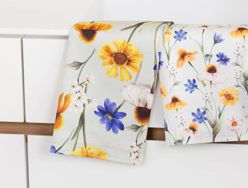 Potisk: jednostranný, obě utěrky zachycují stejný florální motiv s odlišnou velikostí květin