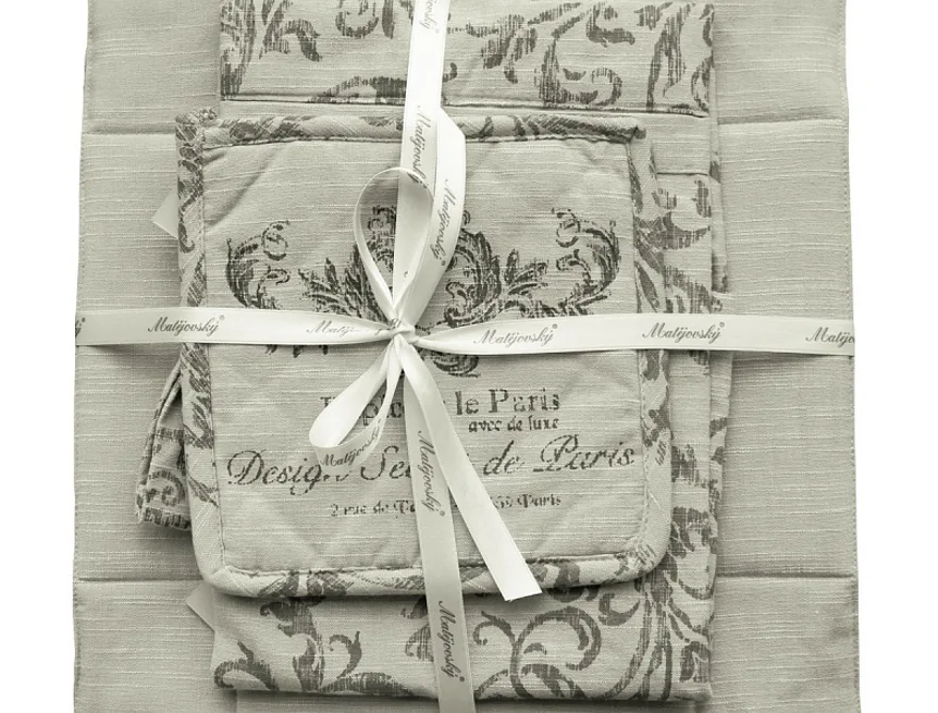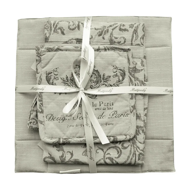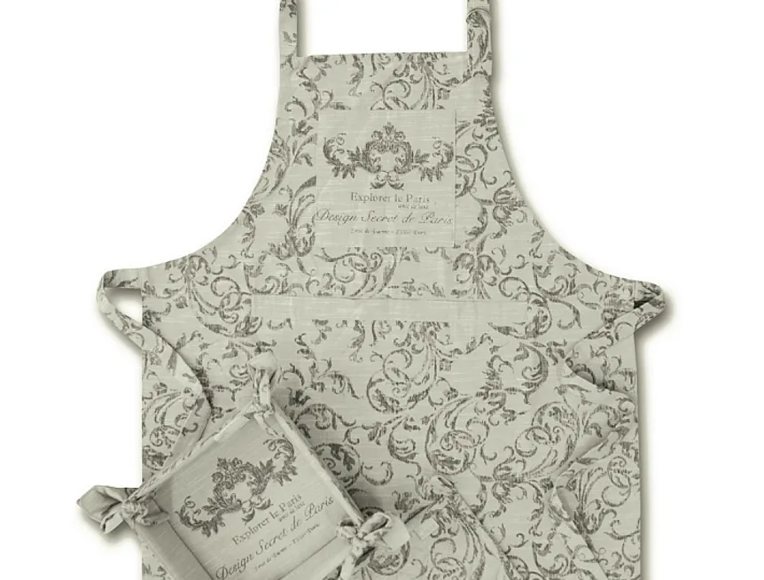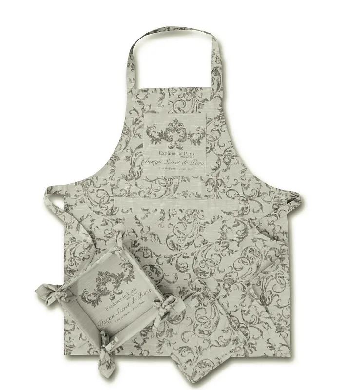Doplňky, které dodají Vaší kuchyni eleganci a styl. Decentní barevná kombinace béžové a tmavě šedé, doplněná jemným květinovým vzorem dává celému setu nádech starých časů.
