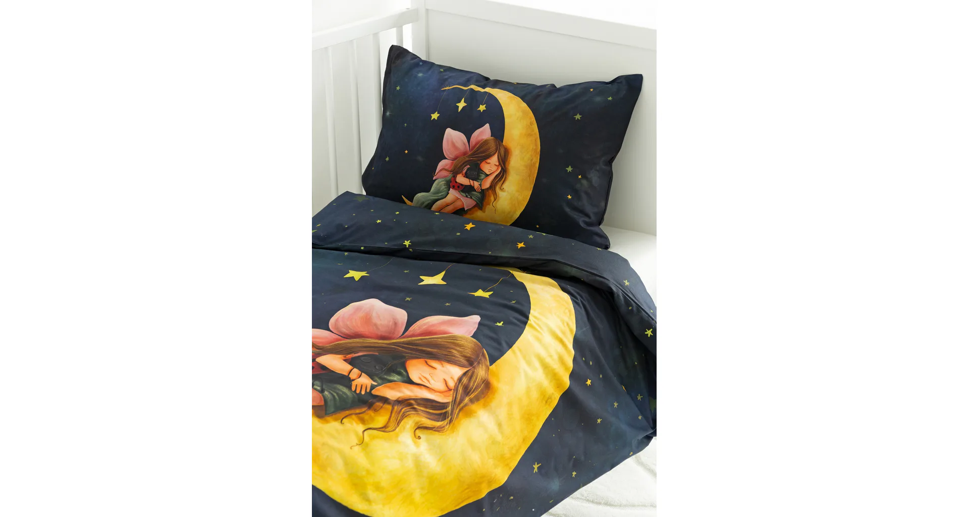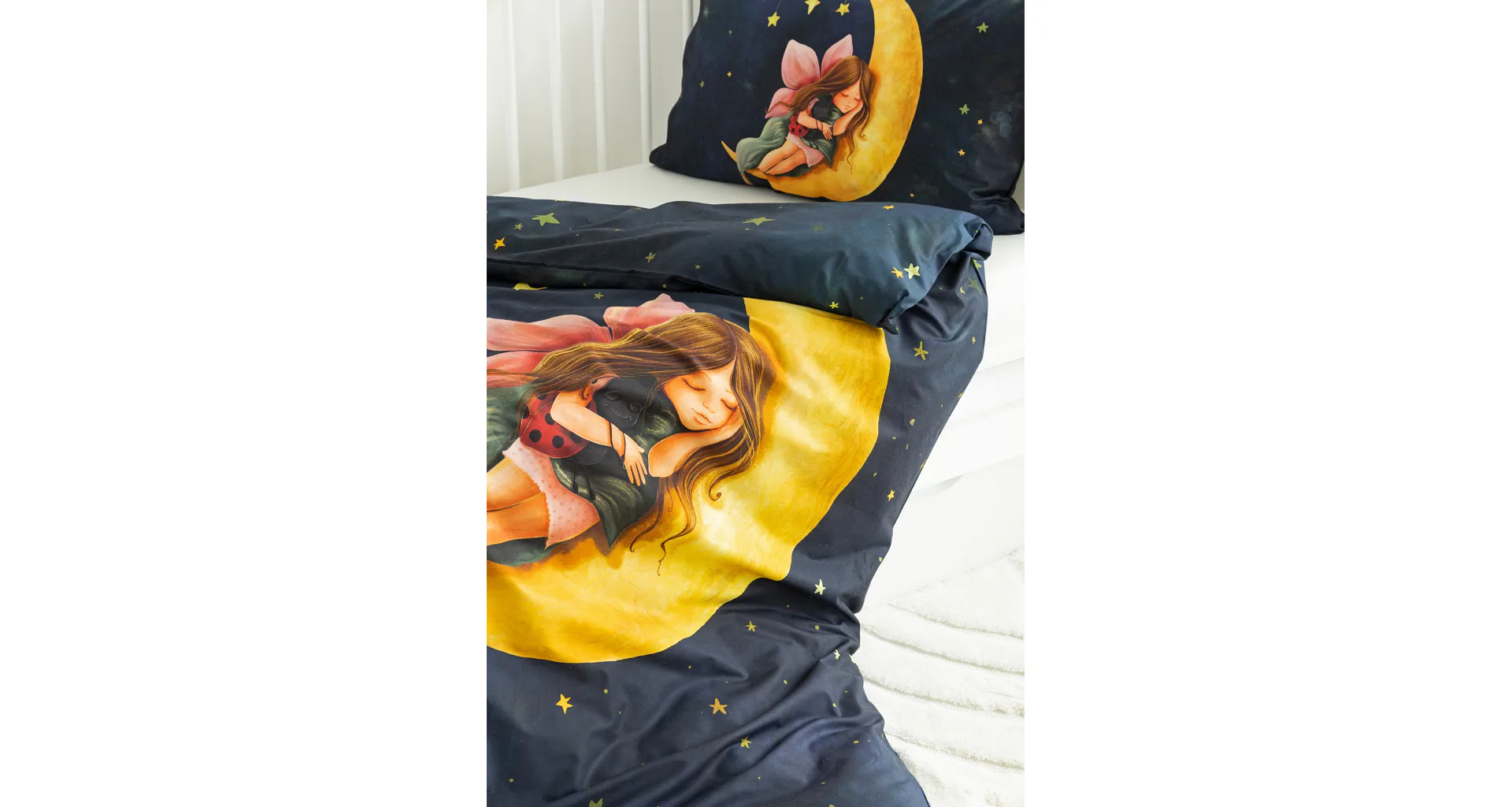 Proměňte dětský pokojíček v kouzelnou říši s bavlněným povlečením Malá víla. Motiv víly spící na měsíci, obklopené hvězdnou oblohou, vnese do dětského pokoje magickou atmosféru. Povlečení je vyrobeno ze 100% prémiové bavlny v úpravě DELUXE, která je jemná na dotek a prodyšná.