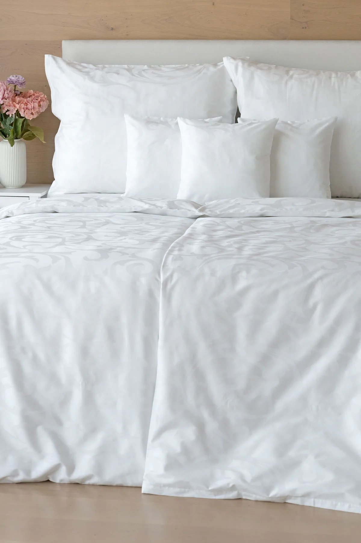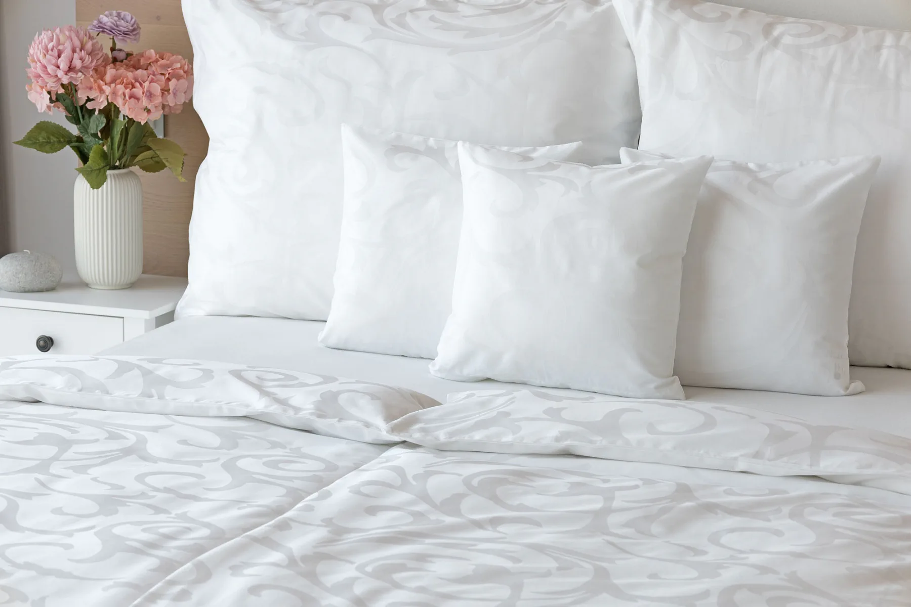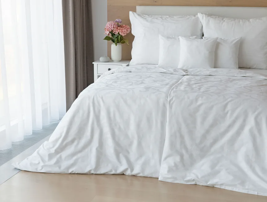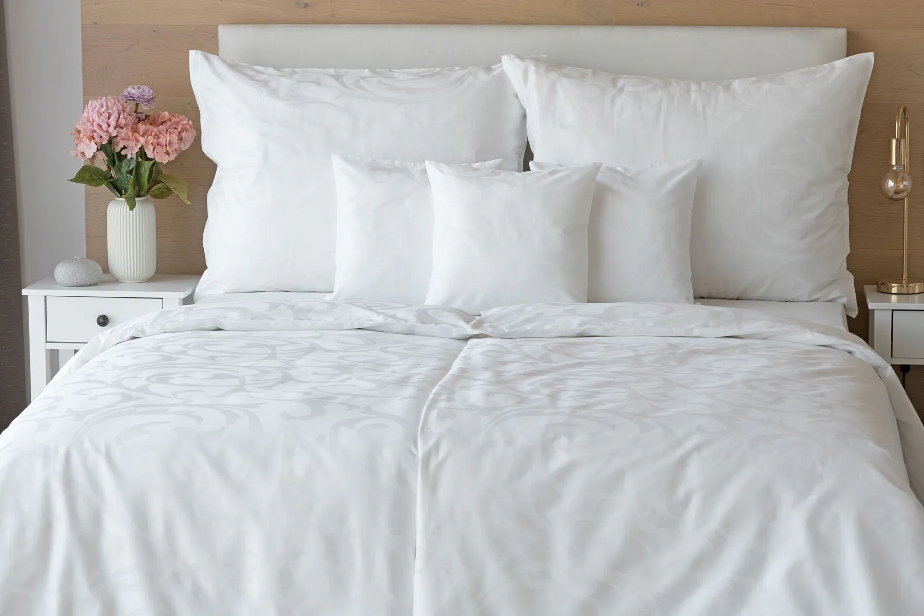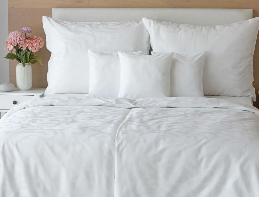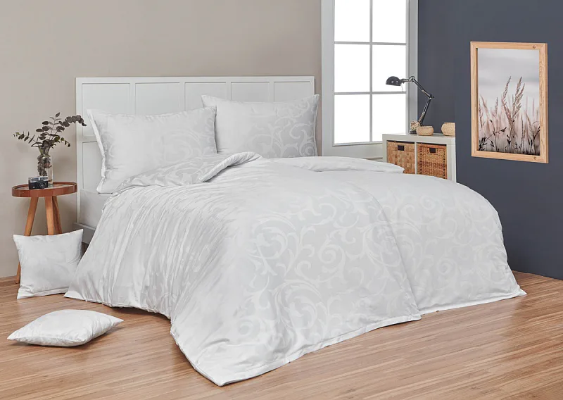 Pure white bedding in a luxurious damask. Bedding is made of high quality combed 100% cotton yarn.