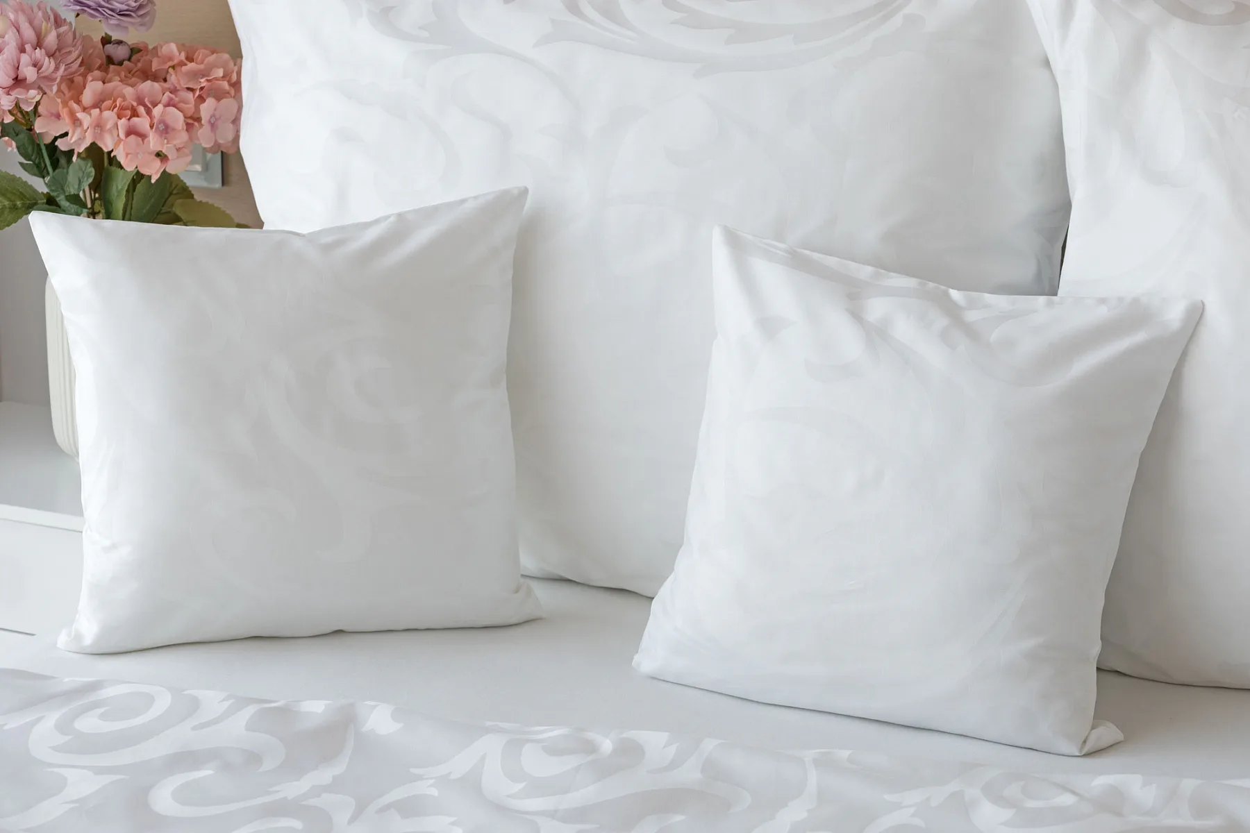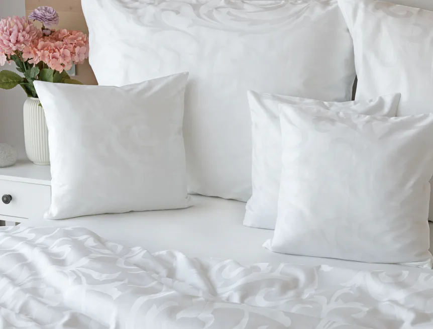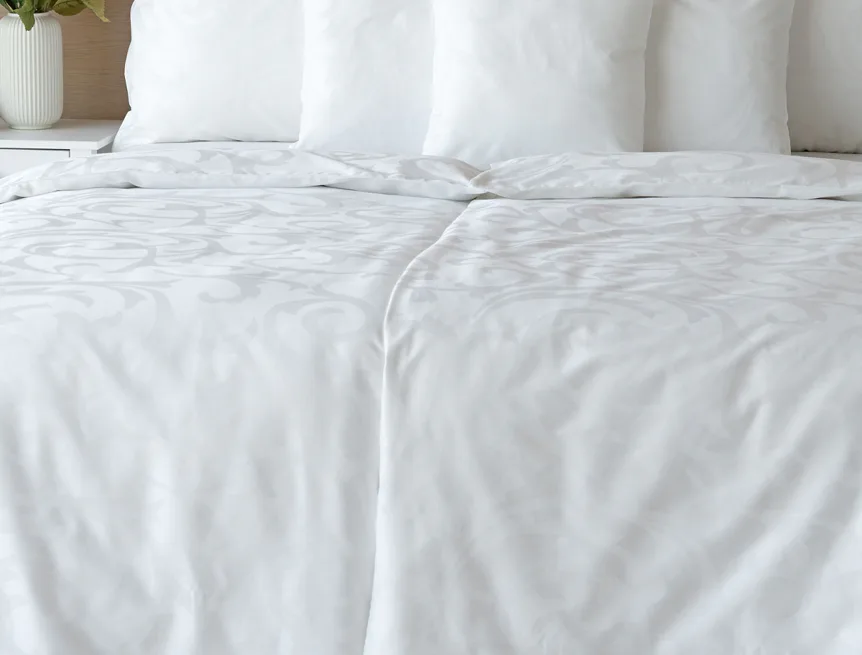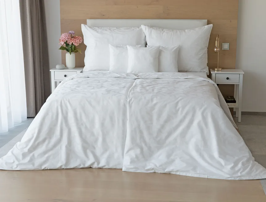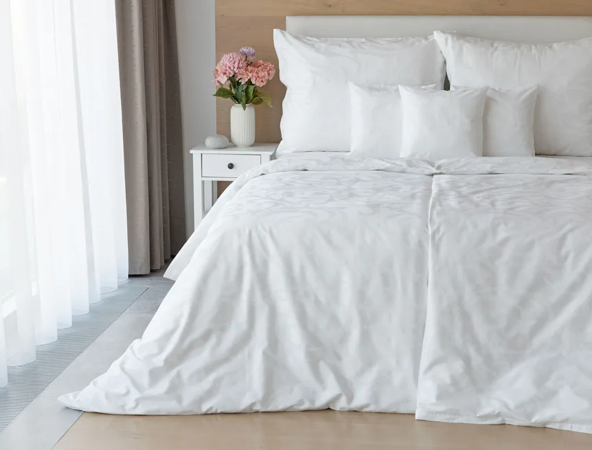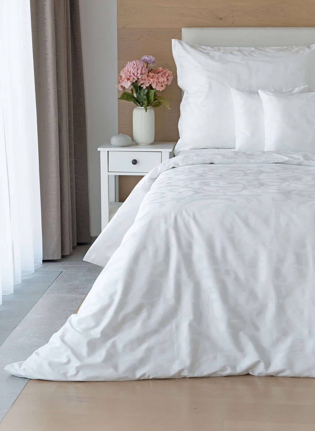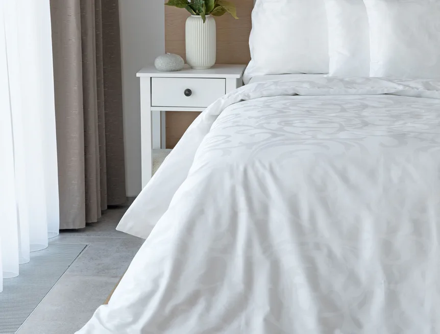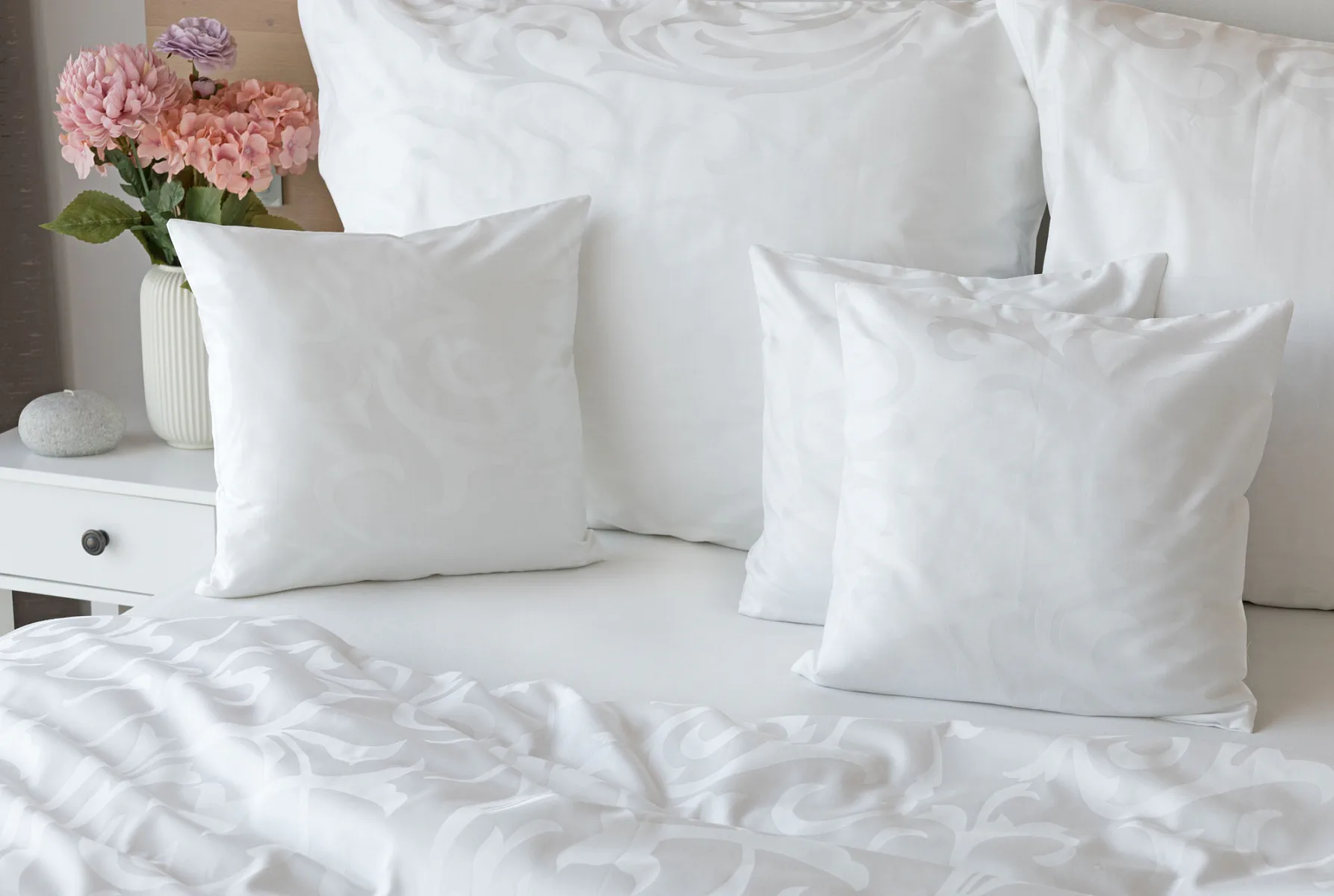 Pure white bedding in a luxurious damask. Bedding is made of high quality combed 100% cotton yarn.