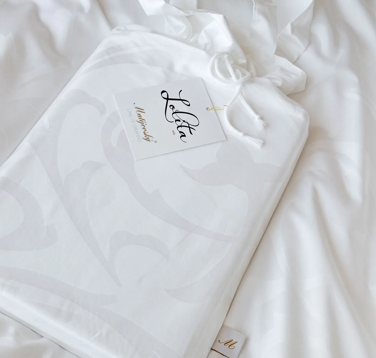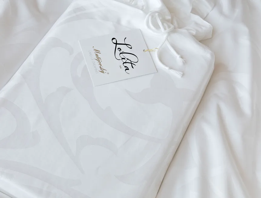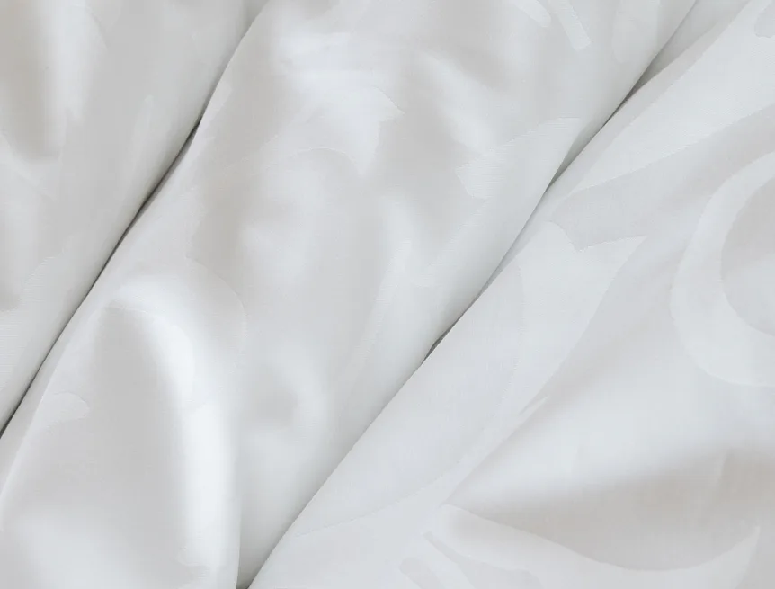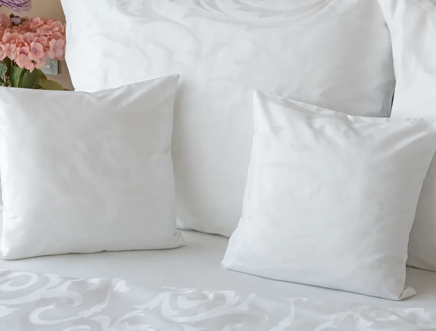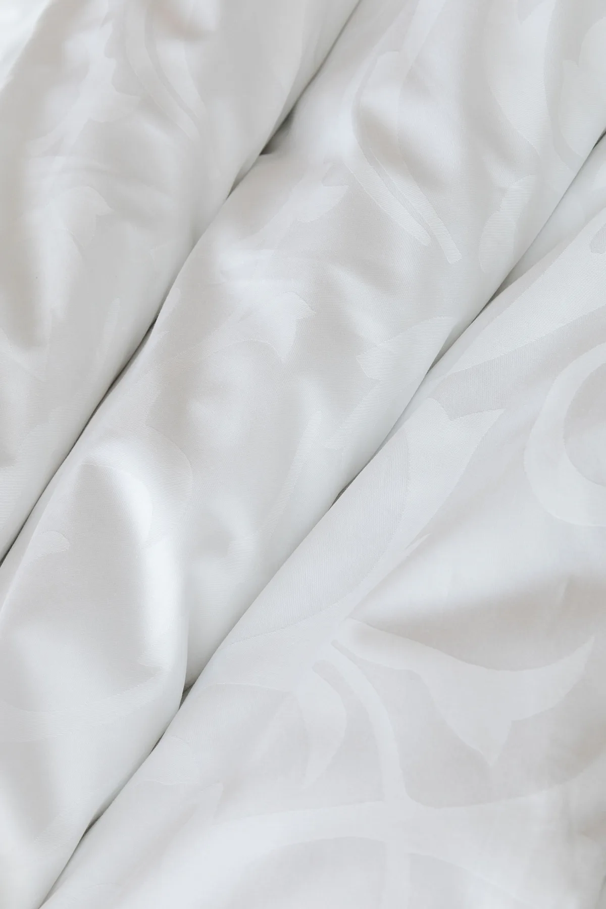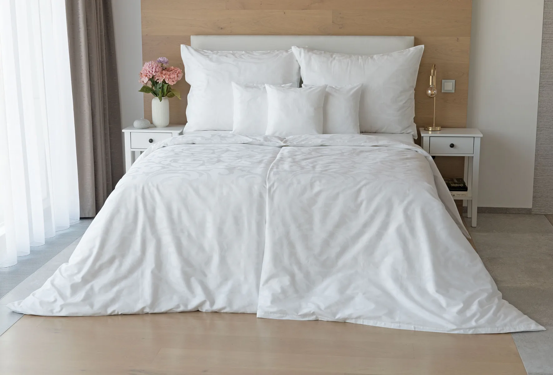 Pure white bedding in a luxurious damask. Bedding is made of high quality combed 100% cotton yarn.
