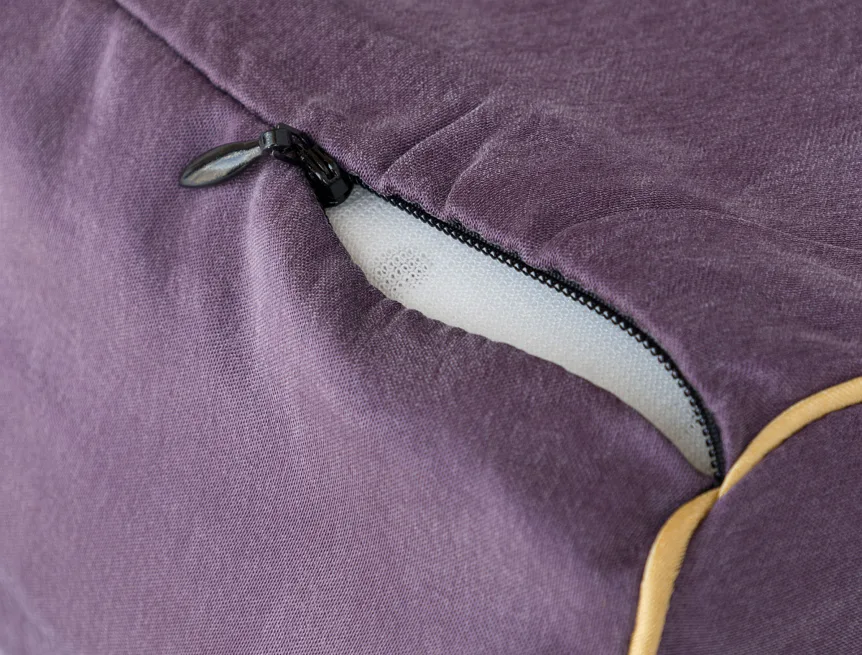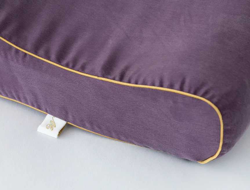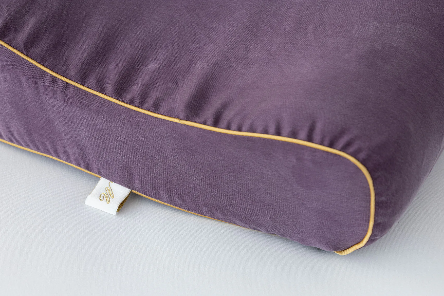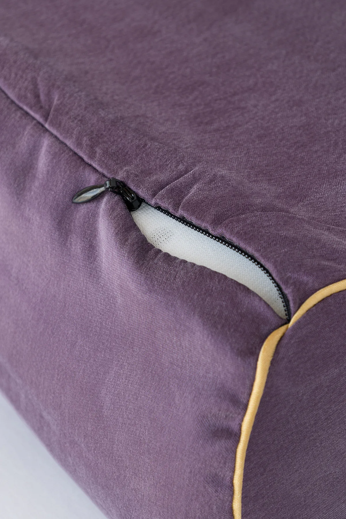 Polštář Vegan v tlumené fialové barvě se zlatou paspulí se stane nepřehlédnutelným designovým doplňkem vaší ložnice.