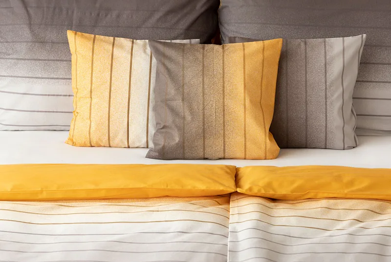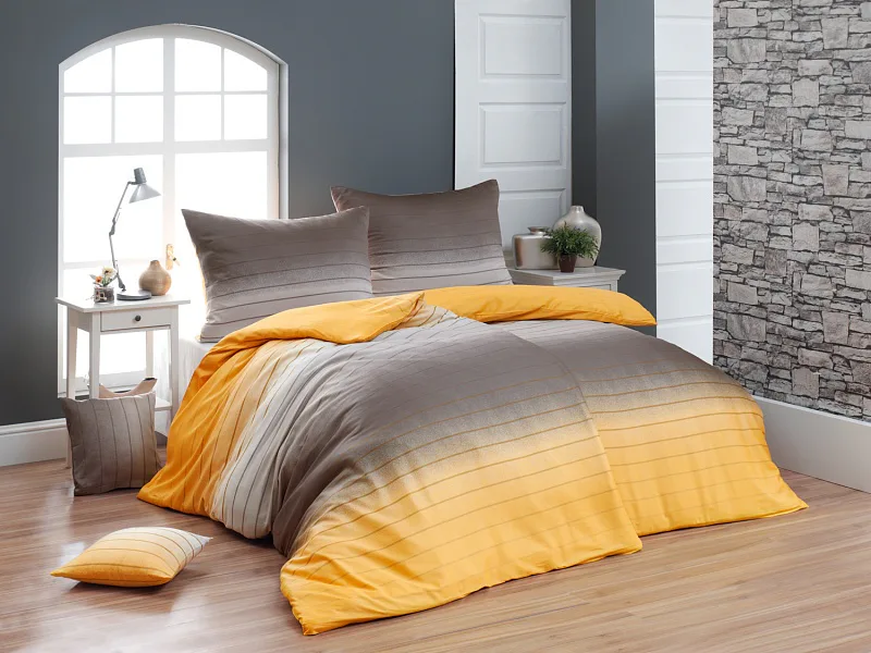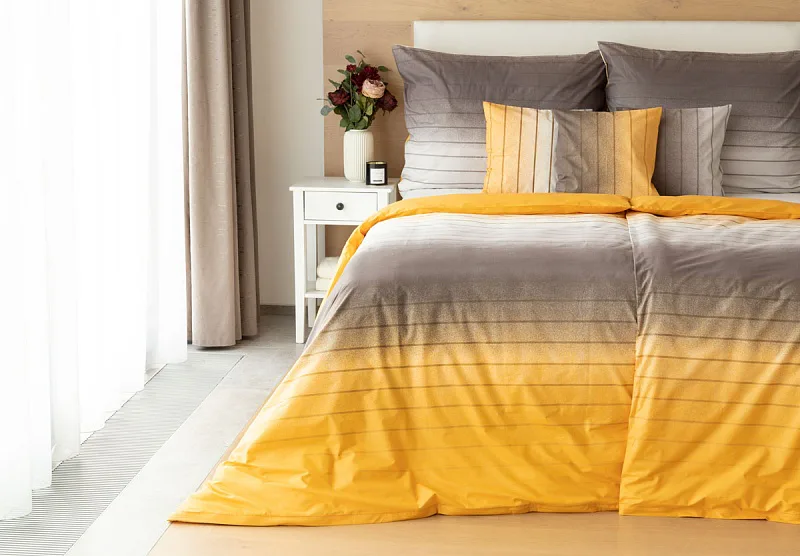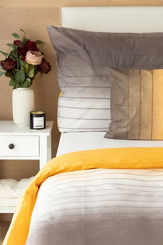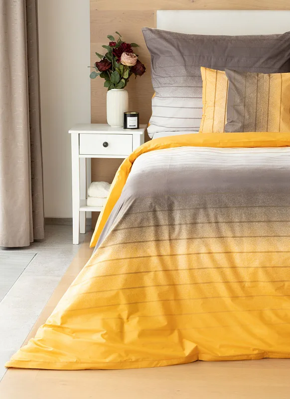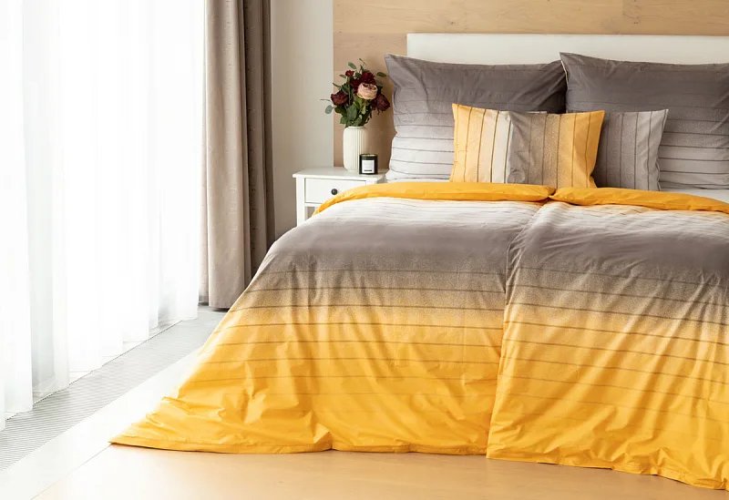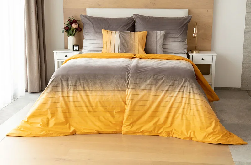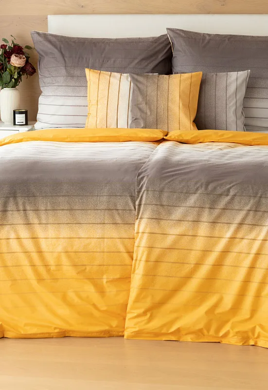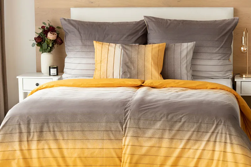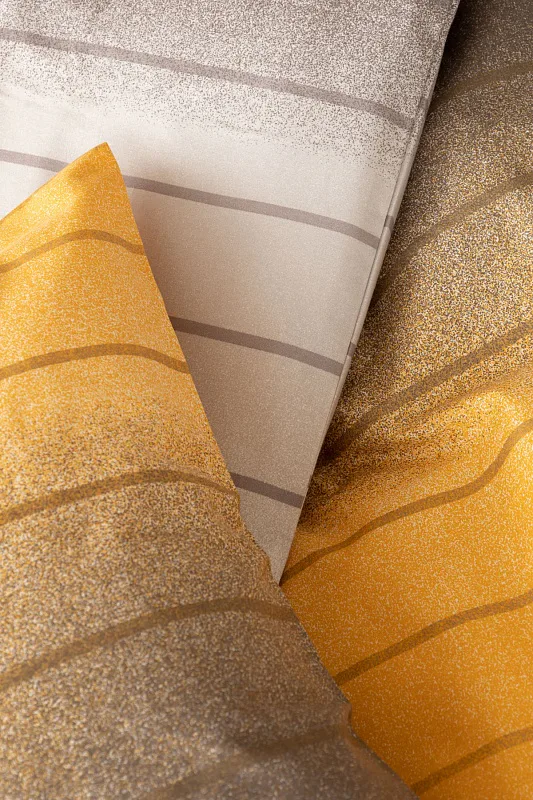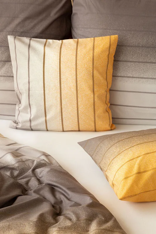 Are you looking for a bed linen with subtle design? Our pattern Melina Gold combines grey tones with warm honey yellow shades. Its subtle stripes with ombré effect give the bed linen an elegant appearance.