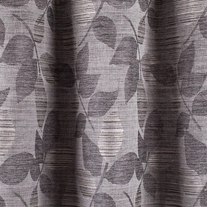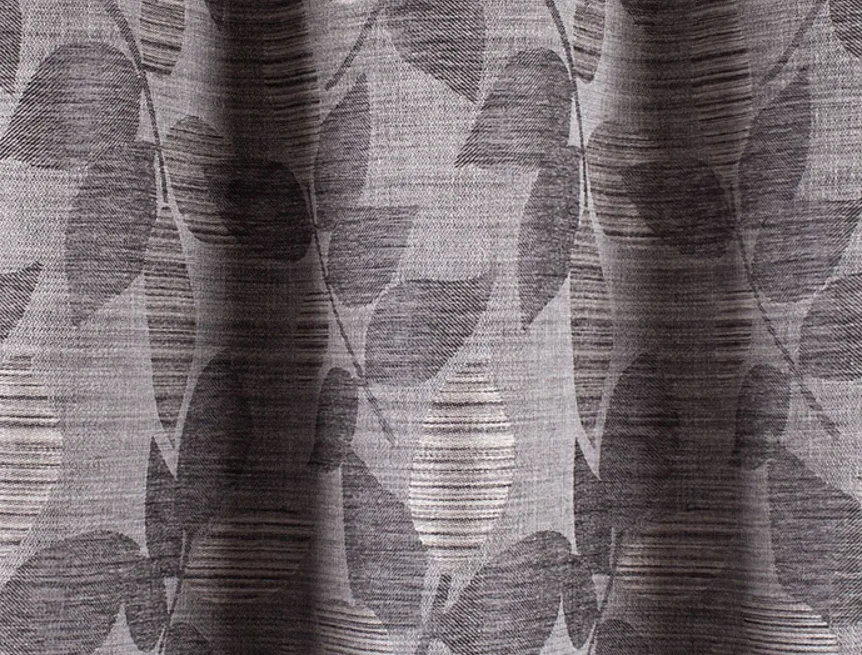 Látka má nepravidelnou proužkovanou strukturu doplněnou a lístečkový motiv, jehož výsledná barevnost se skládá z perfektně sladěných odstínů černé, antracitové šedé a šedobéžové. Látka je částečně zatemňující, nejedná se o blackout. Imitace jemně tkané přírodní struktury dodává nadčasovou eleganci.