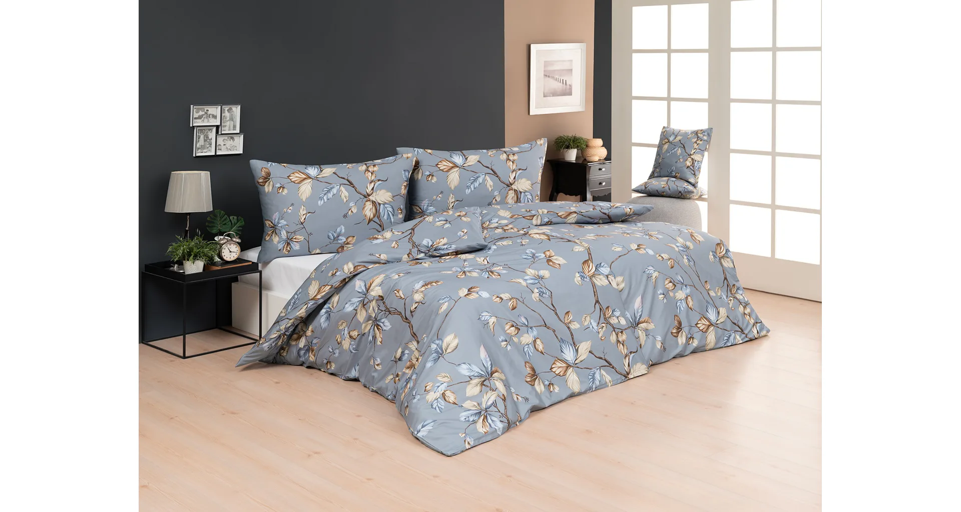 Nobilis bed linen will delight you in every way. At first glance, you will fall in love with the simple floral motif in warm colors and at the first touch you will fall under the spell of the soft mako satin made of 100% cotton, which will ensure your peaceful sleep. The background color of the bedding is metallic blue-grey.
