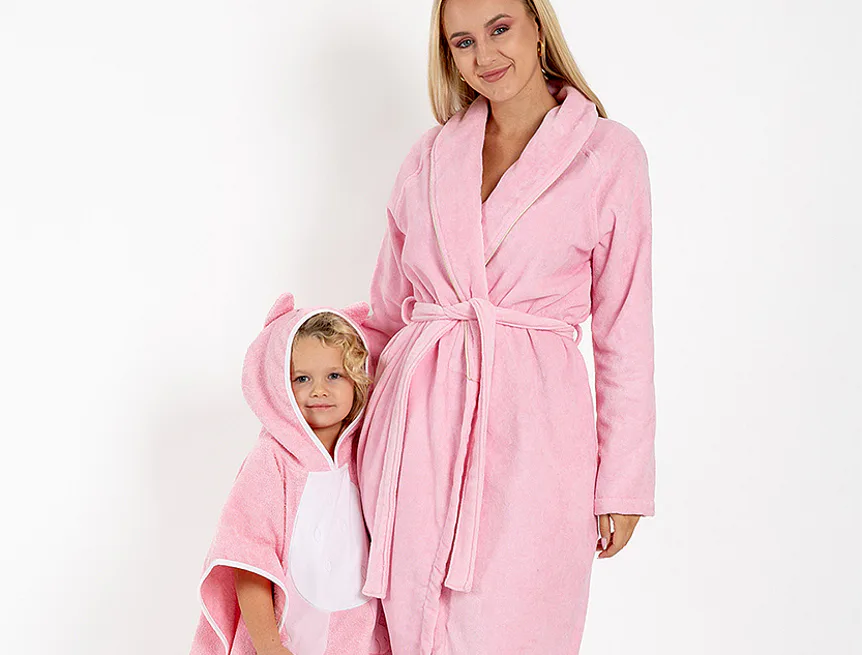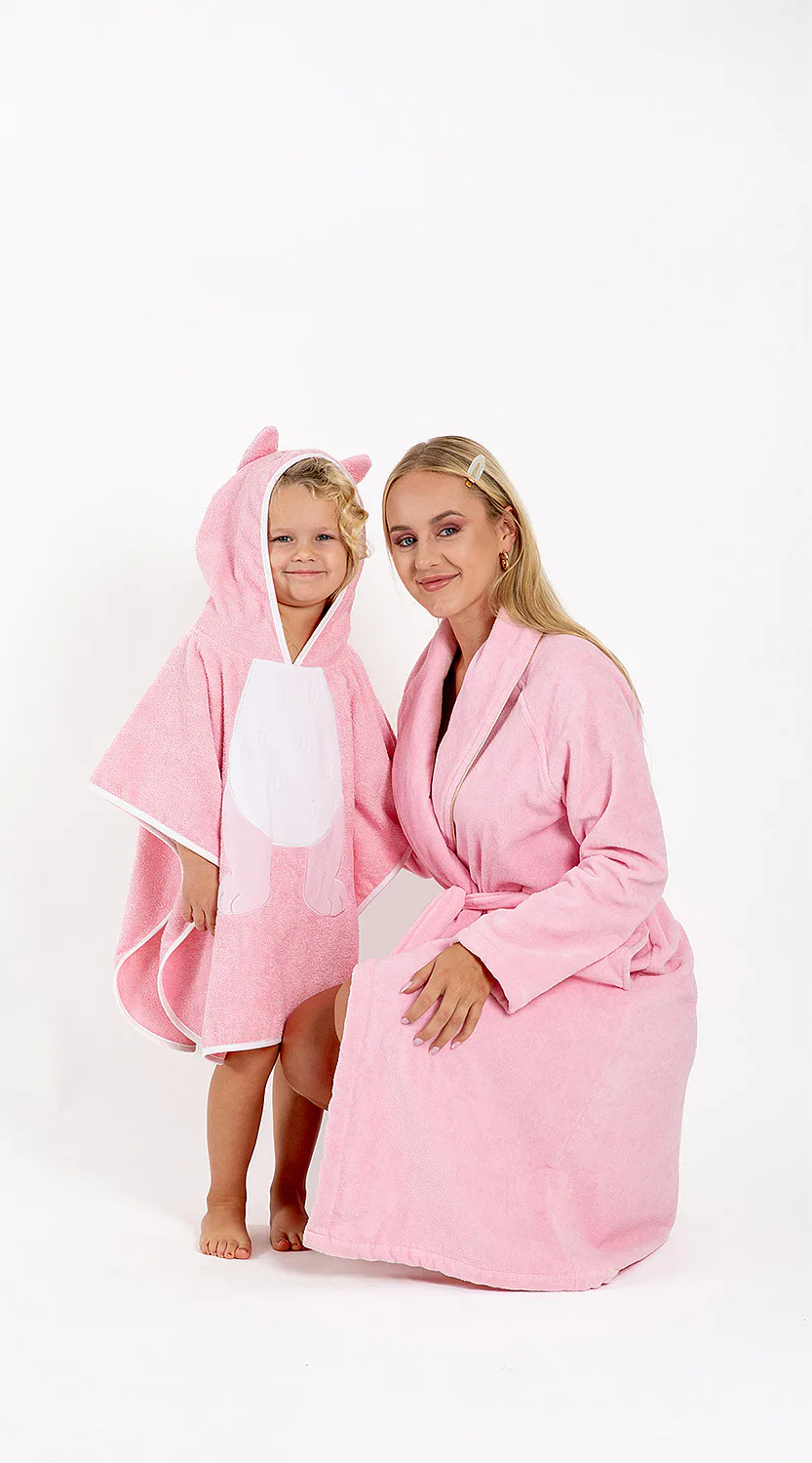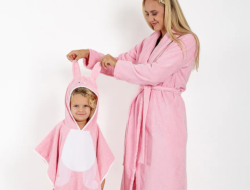 Dětské froté pončo se zvířecí výšivkou je ideální společník po koupeli, plavání nebo dovádění u moře. Výšivka s motivem zajíčka laděná do růžových tónů potěší hlavně malé princezny!