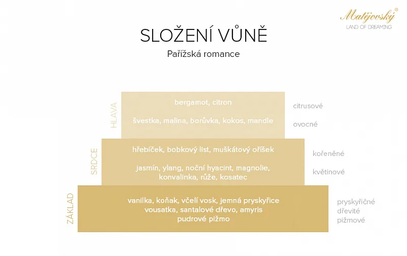 Vůně Pařížská romance Vás obklopí pronikavou, sladkou ovocnou vůní s jemnými akcenty kořeněného květinového podkladu.