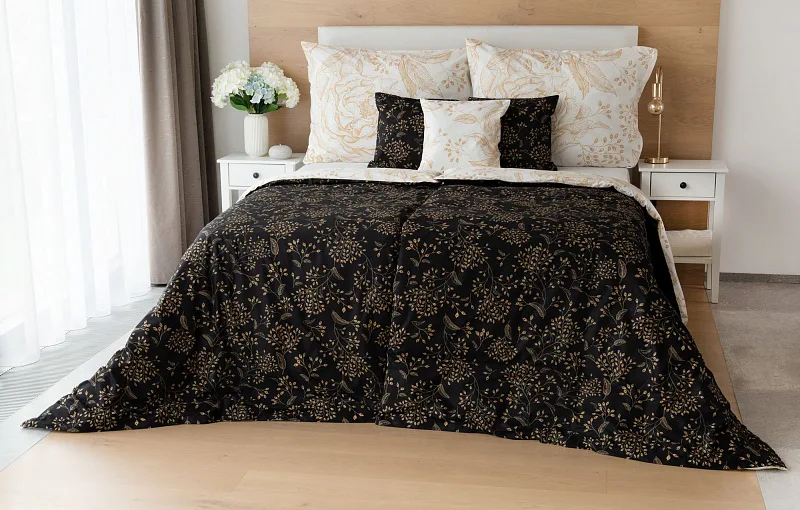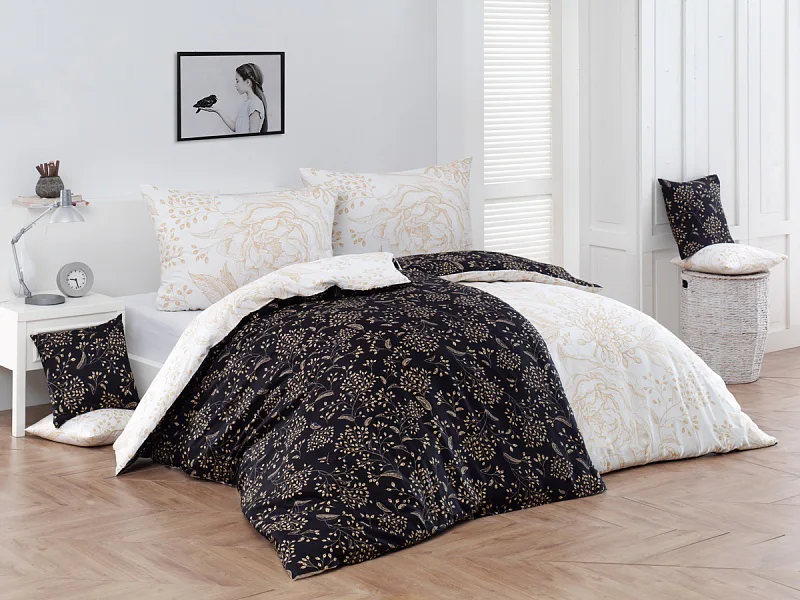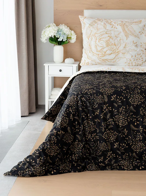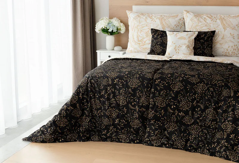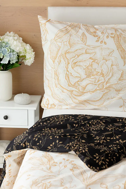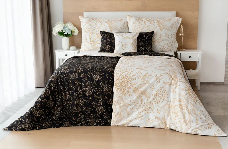 The delicate golden floral pattern excels in the inverted design. It is subtly printed on a white background from the top of the quilt cover, and the same pattern adorns the black background from the bottom. The pillowcase is decorated on both sides with a floral drawing on a white background. Bedding is made of 100% cotton, the closure is very practical due to a zipper.