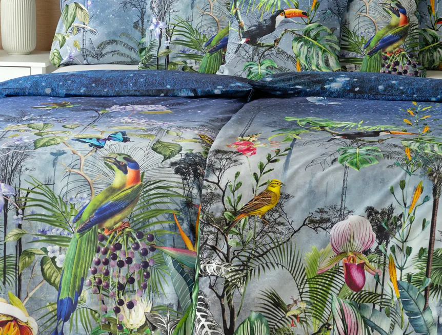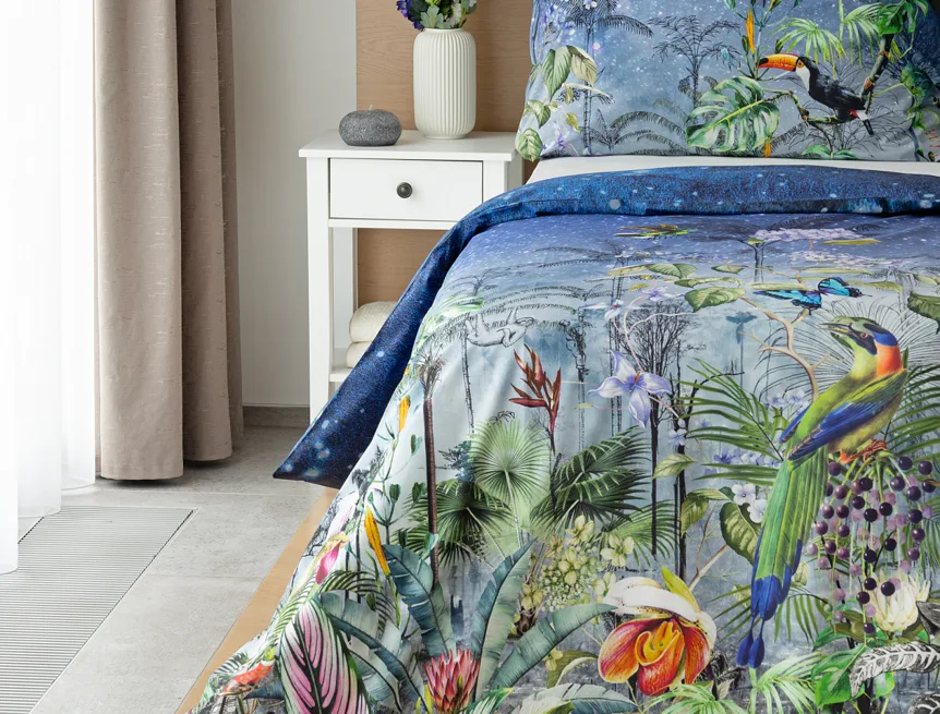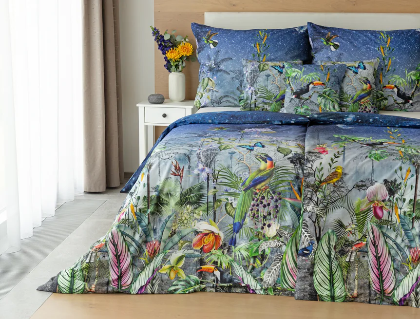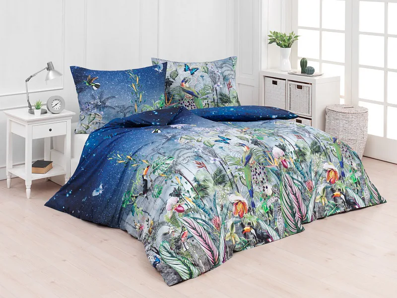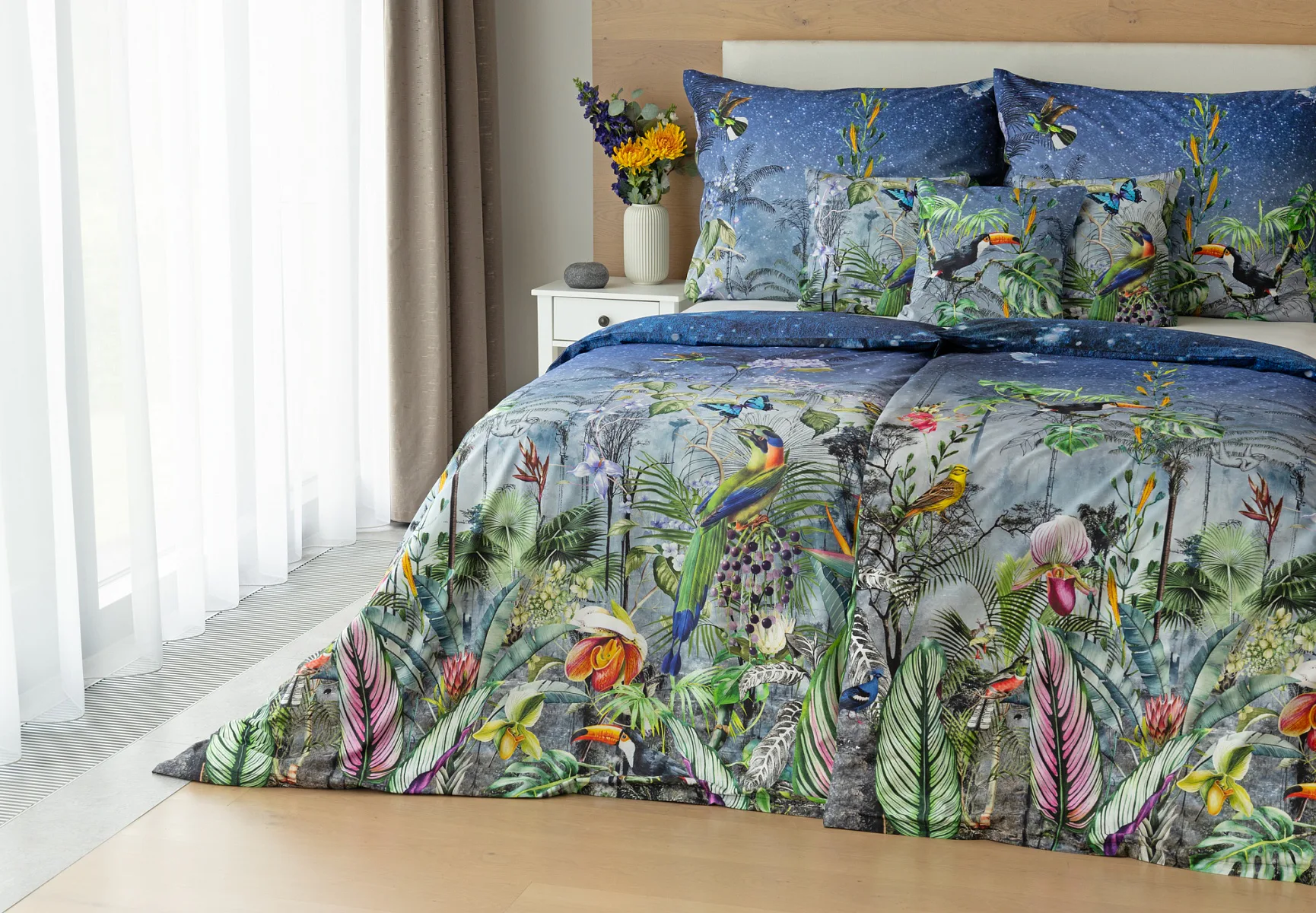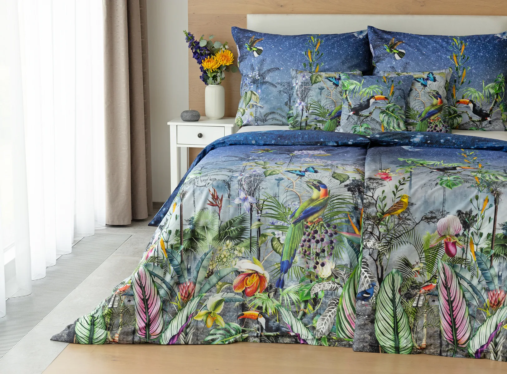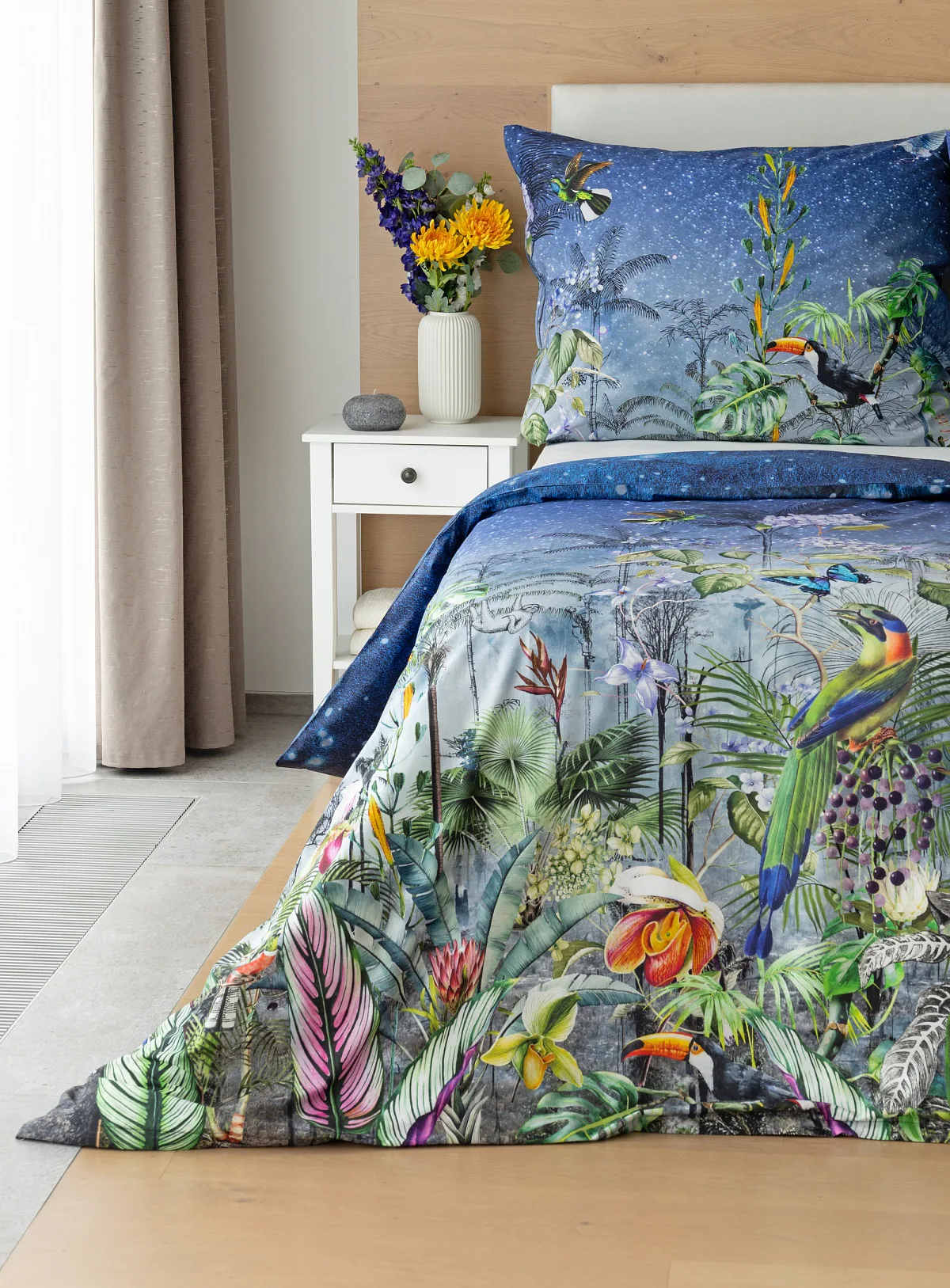 Surround yourself with exotics with Paradise cotton bedding. The combination of painting and drawing created the motif of an exotic forest with unbridled flora and fauna. Thanks to the state-of-the-art digital printing you can enjoy every detail.