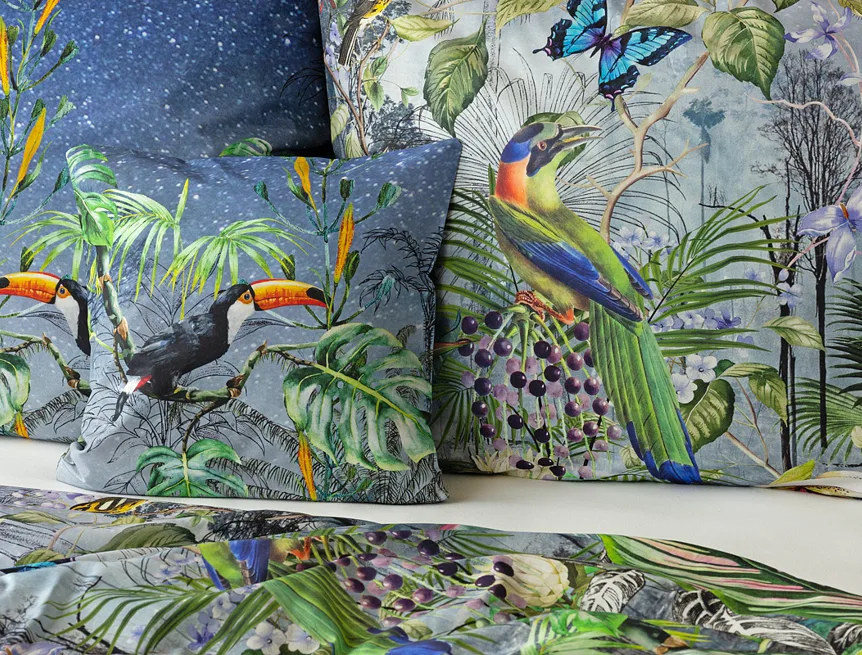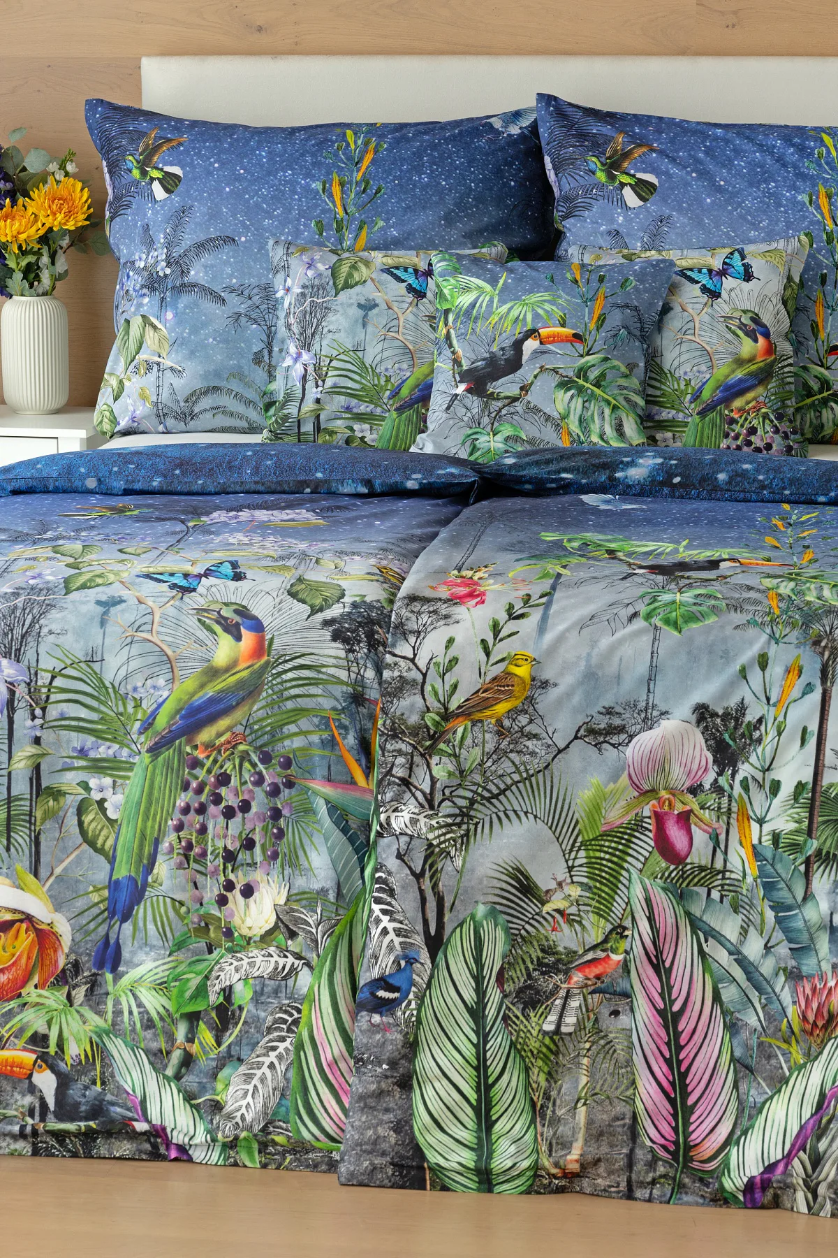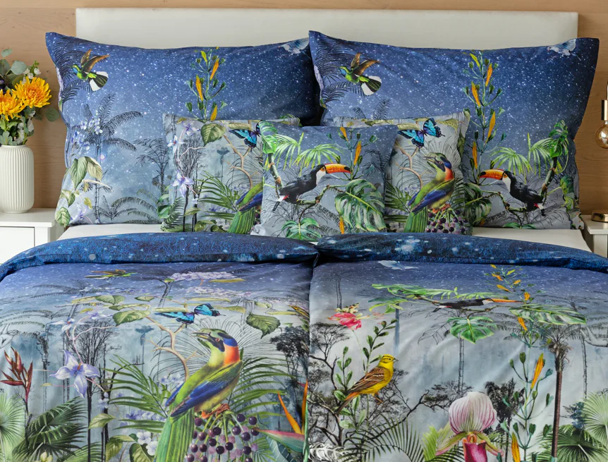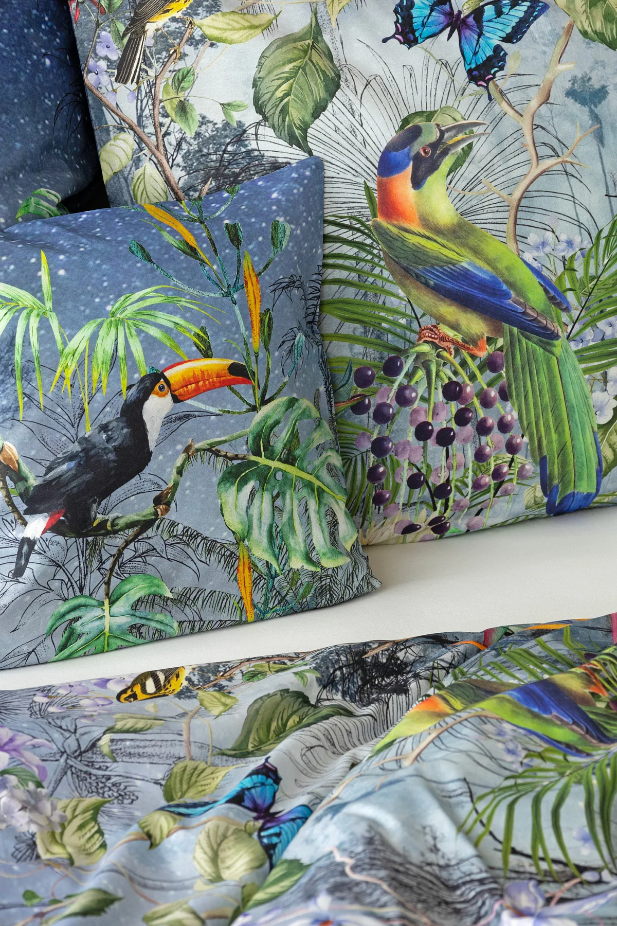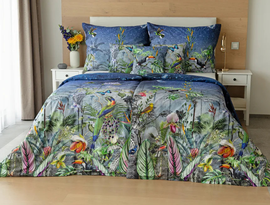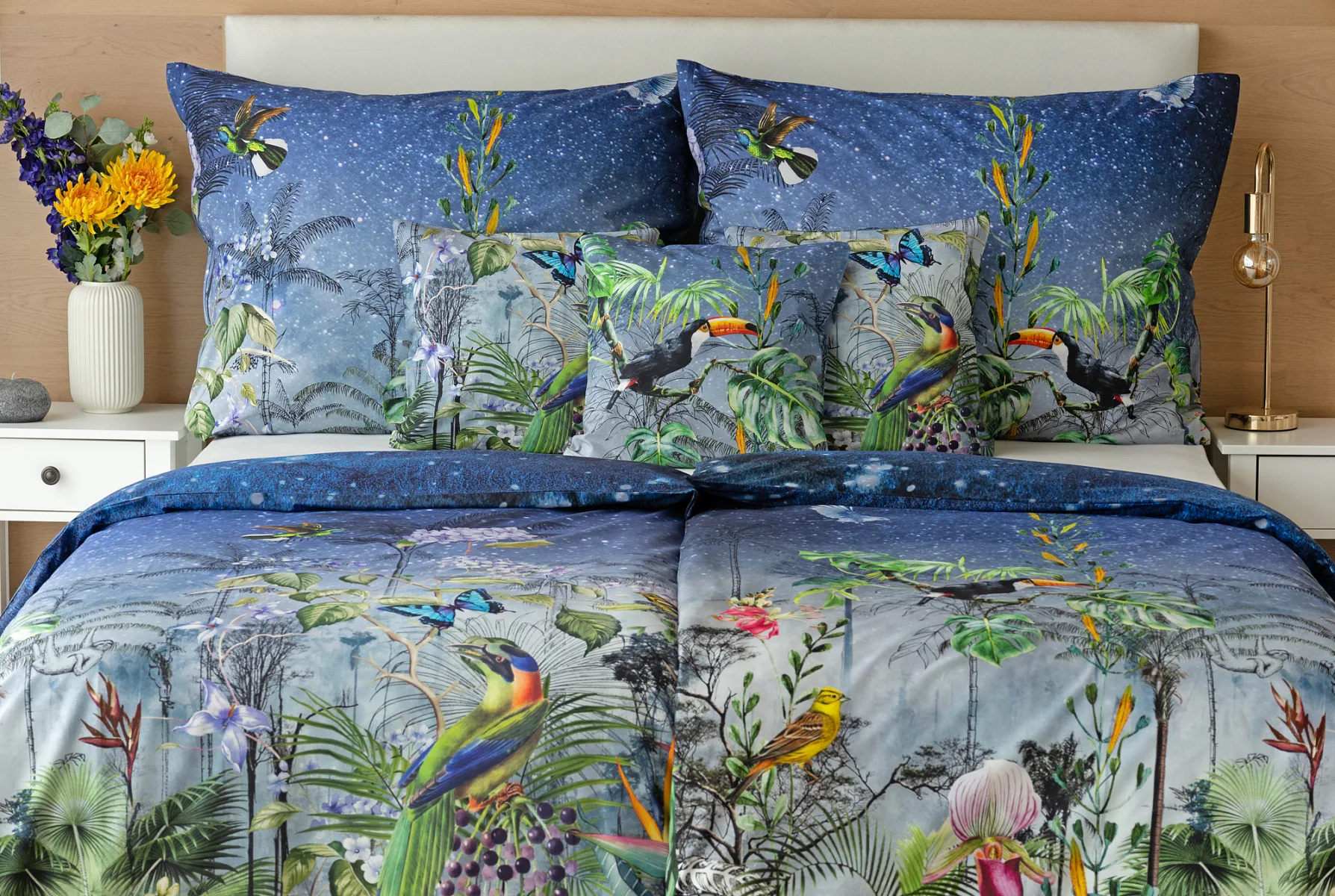 Surround yourself with exotics with Paradise cotton bedding. The combination of painting and drawing created the motif of an exotic forest with unbridled flora and fauna. Thanks to the state-of-the-art digital printing you can enjoy every detail.