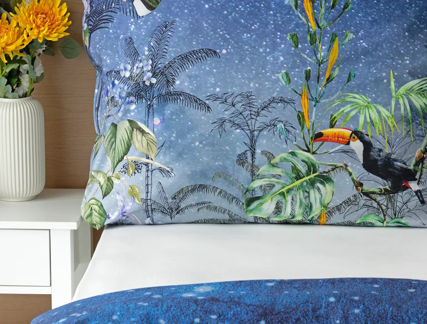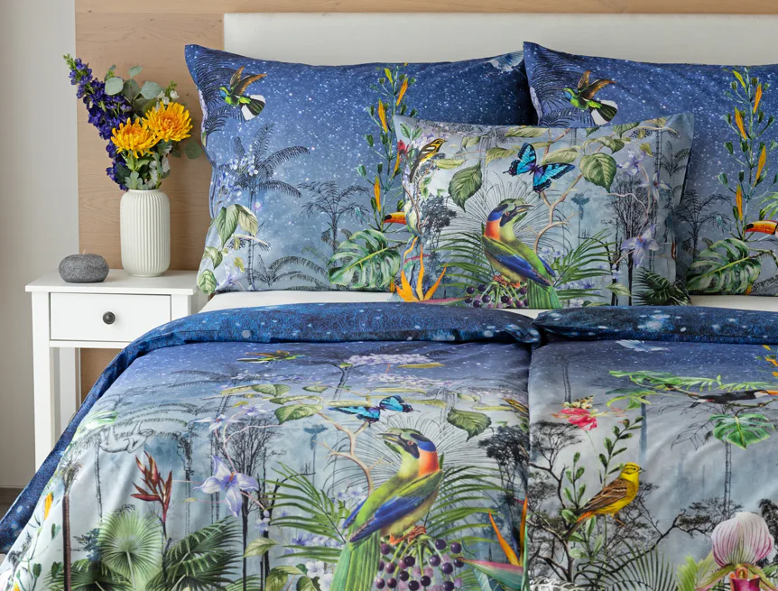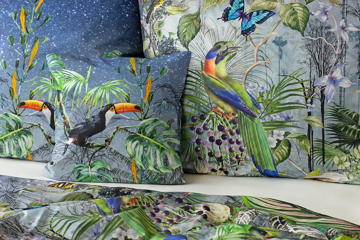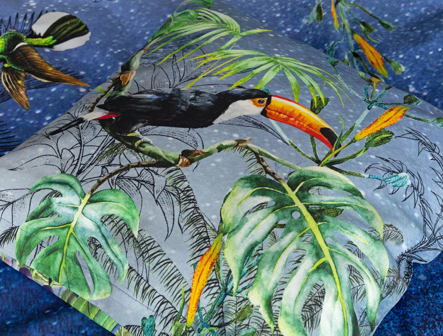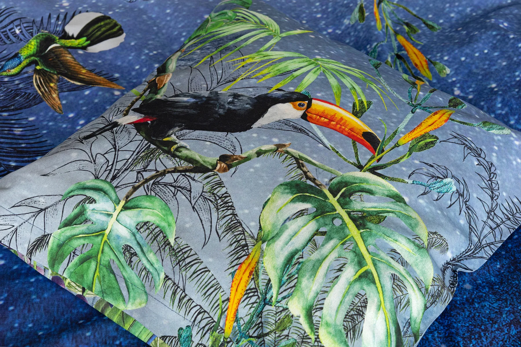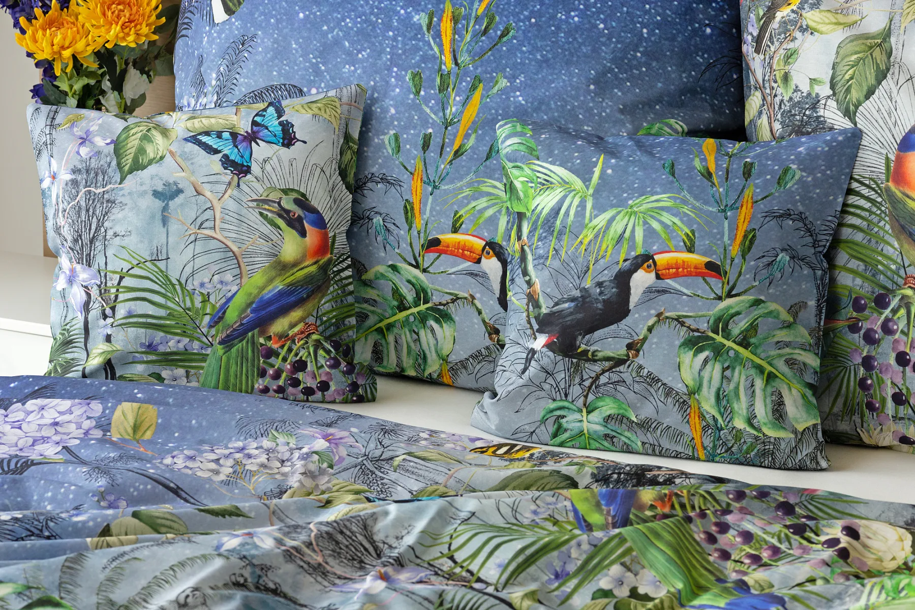 Surround yourself with exotics with Paradise cotton bedding. The combination of painting and drawing created the motif of an exotic forest with unbridled flora and fauna. Thanks to the state-of-the-art digital printing you can enjoy every detail.