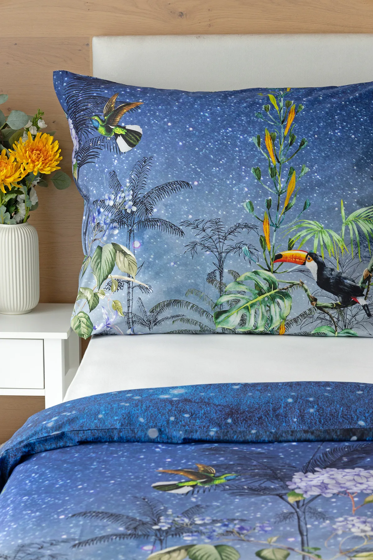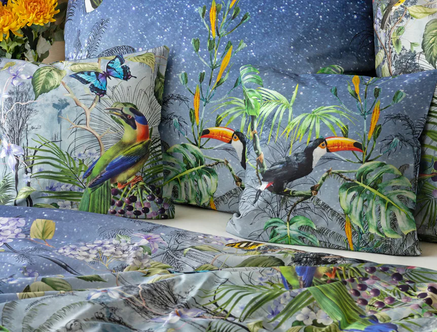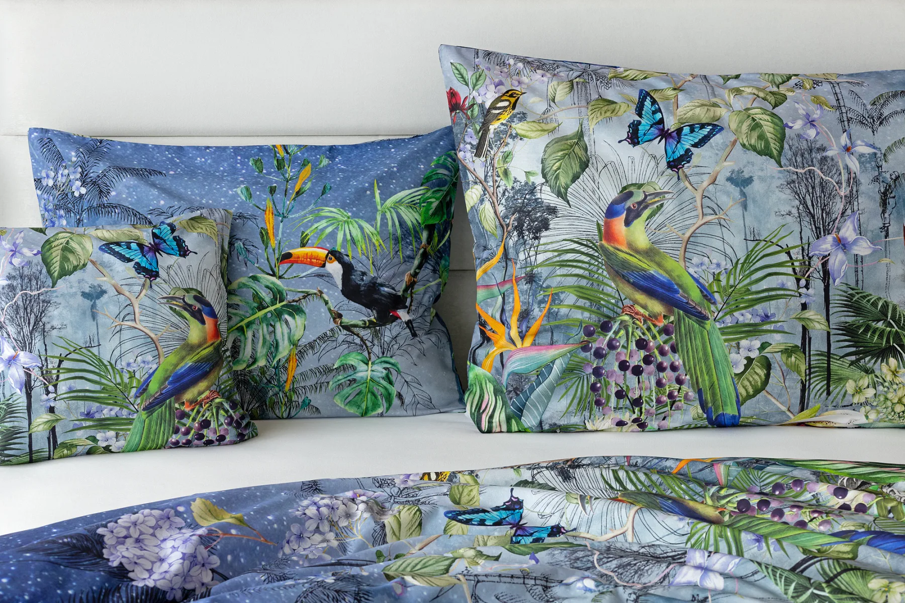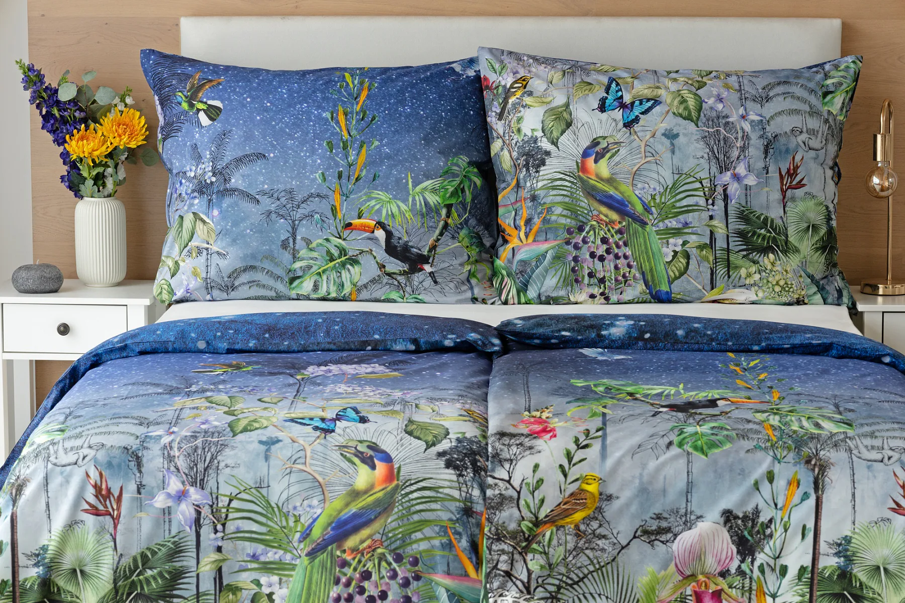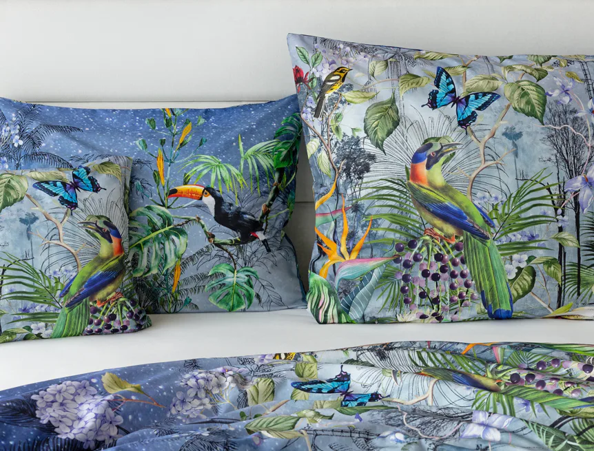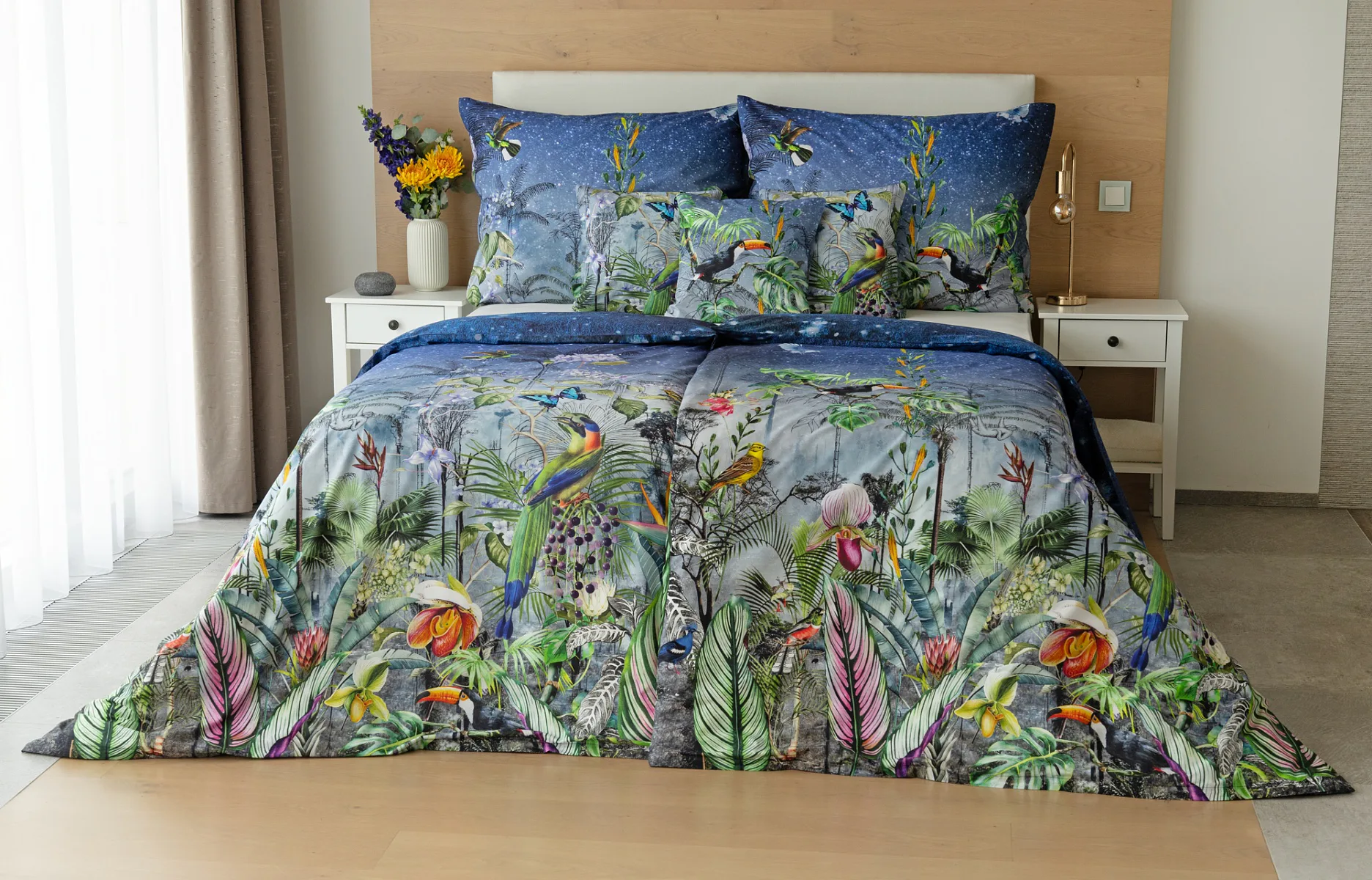 Surround yourself with exotics with Paradise cotton bedding. The combination of painting and drawing created the motif of an exotic forest with unbridled flora and fauna. Thanks to the state-of-the-art digital printing you can enjoy every detail.