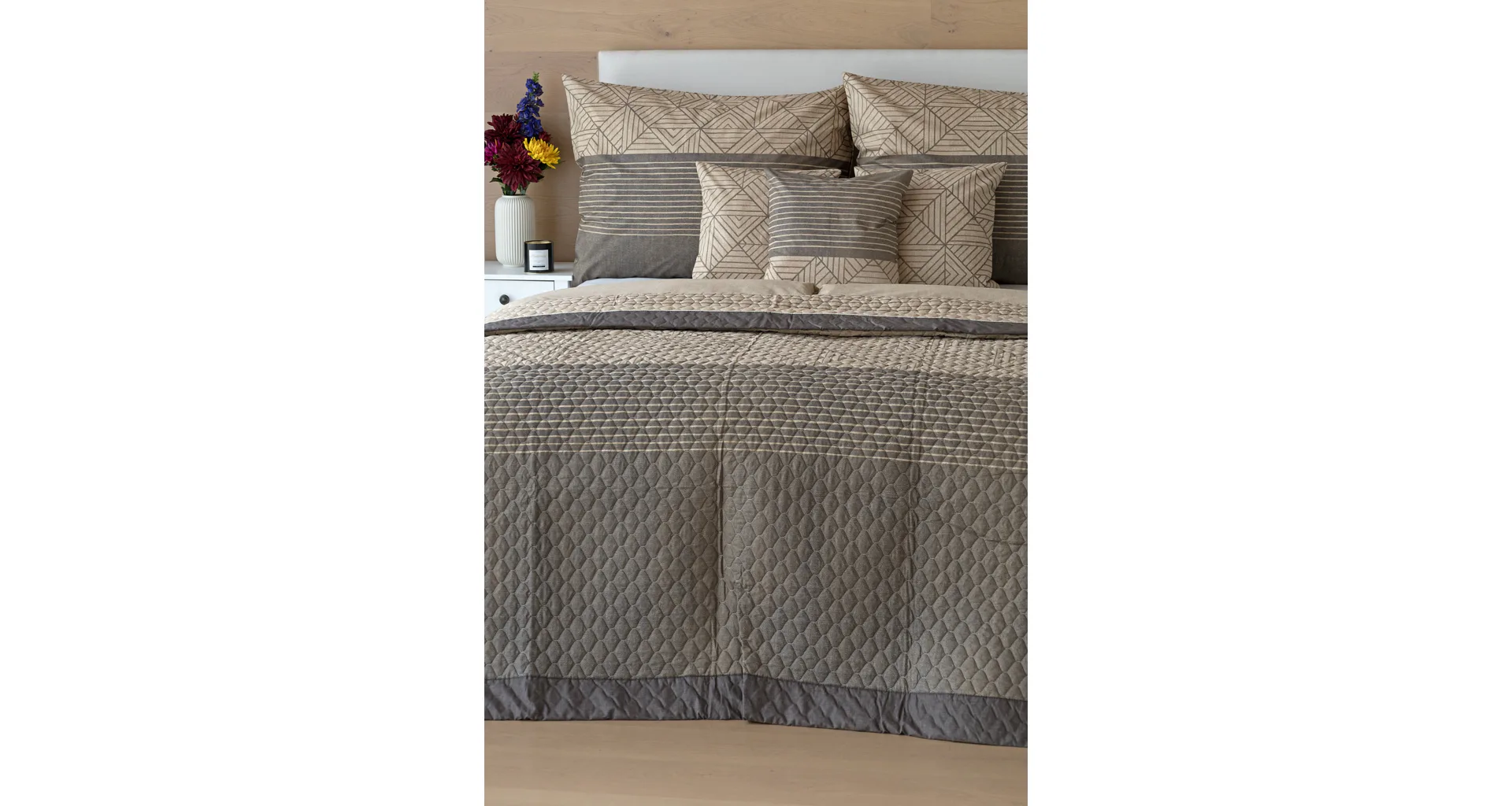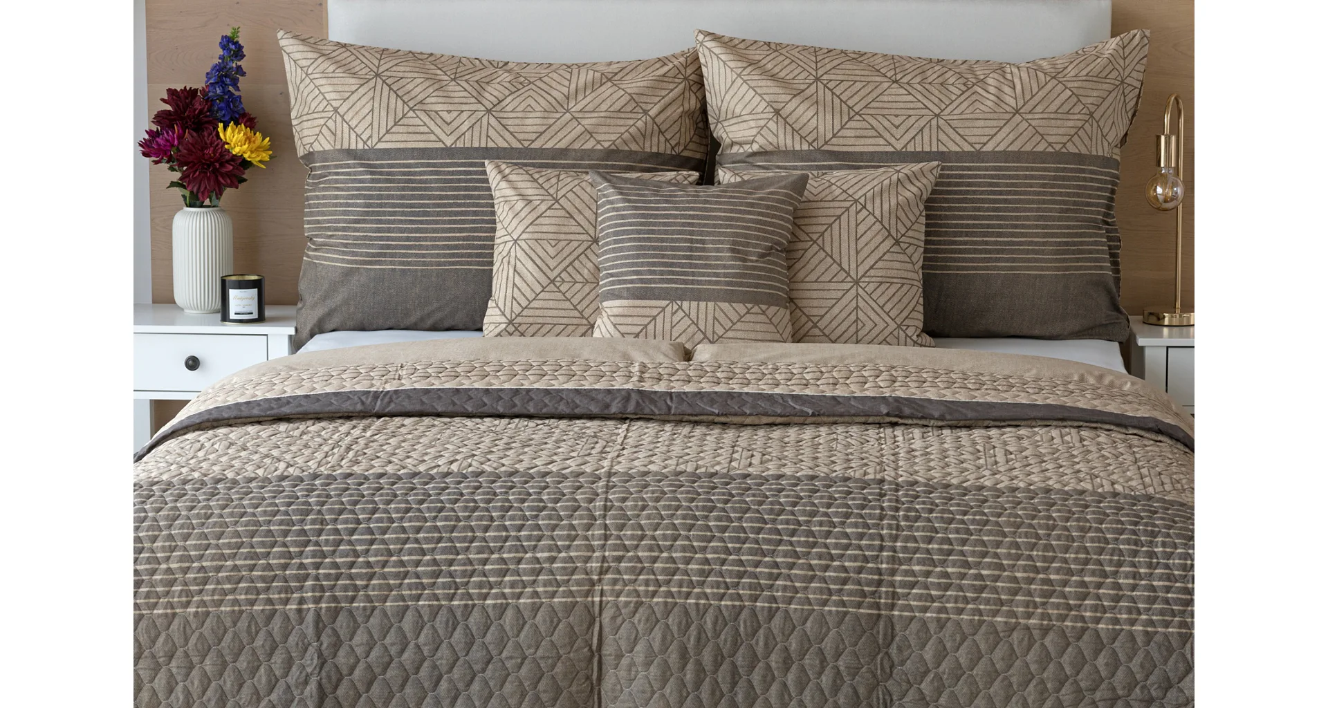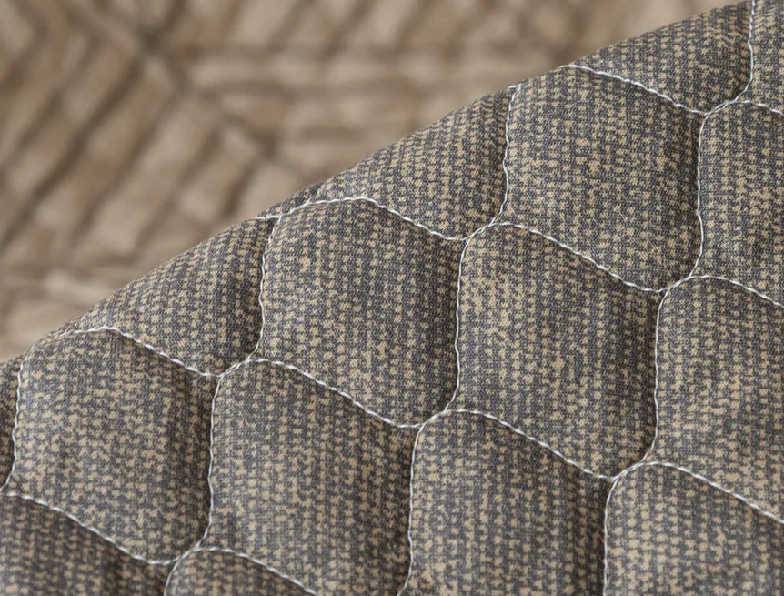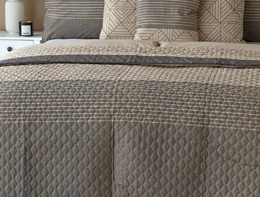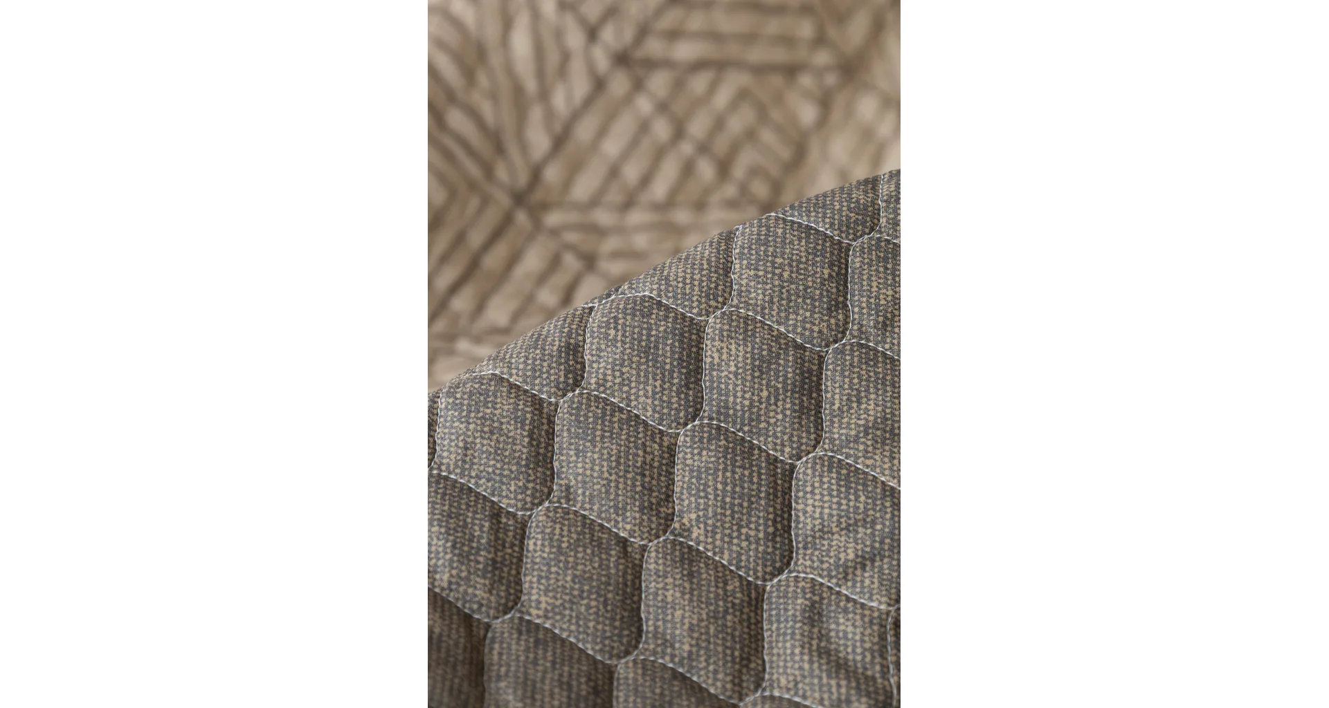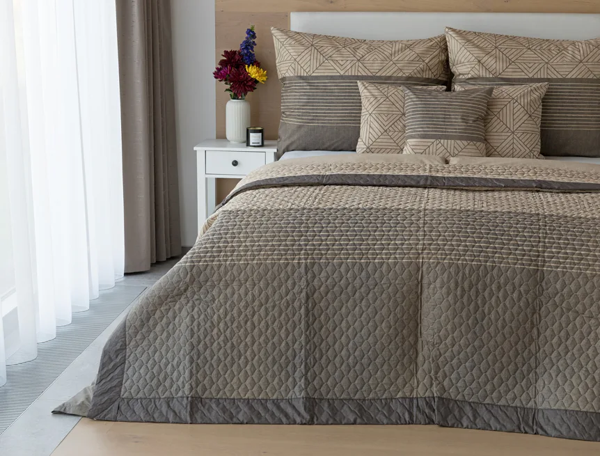 Color design: An impressive geometric pattern with a rustic structure, which is the same on both sides of the bedspread. The edges are decorated with a dark grey edging supplemented on the upper side with white piping.