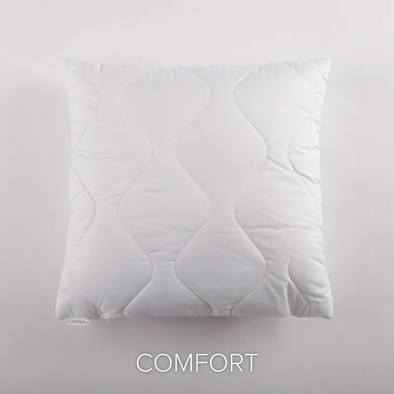 The COMFORT pillow, weighing 280 g, contains a ball hollow fiber filling (100% polyester). Surface material is made of cotton (50%) and polyester (50%). The cover is not removable.