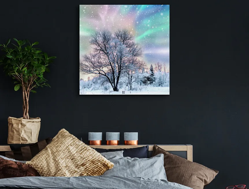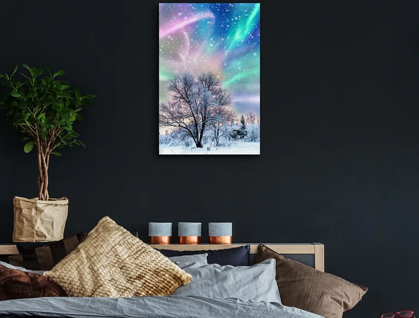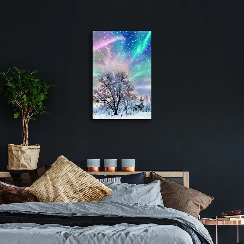With our picture Polarni zare you can create a truly sophisticated atmosphere in your interior.The pattern of the picture is printed on a premium cotton canvas with irregular structure canwas PowerSol Satin.The surface is resistant to tearing and it gives to the canvas a velvety appearance.The picture is delivered on a wooden frame and equipped with a hanging loop.