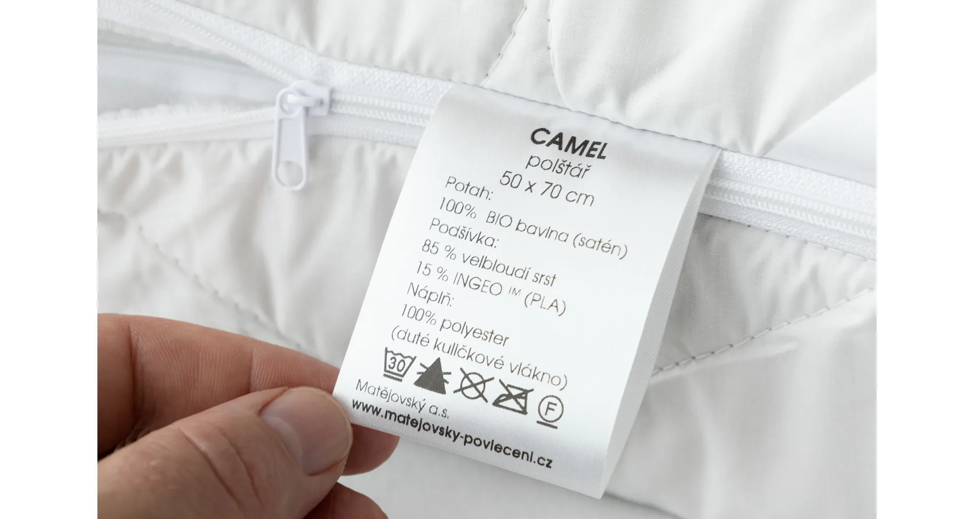 Polštáře z řady Camel splňují kritéria mezinárodní certifikace Oeko-Tex Standard 100 a potahová látka disponuje navíc certifikací GOTS (garantovaný obsah bio certifikovaných vláken minimálně 95 %).