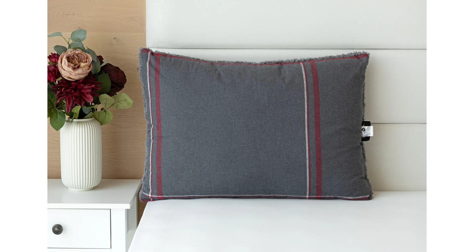 Atraktivní tmavě šedý podklad polštáře Ida protíná bílá a vínově červená linka, spodní stranu zdobí barevně sladěný beránek v tmavě šedém odstínu. K polštáři lze dokoupit také prošívanou přikrývku ve stejném designu.