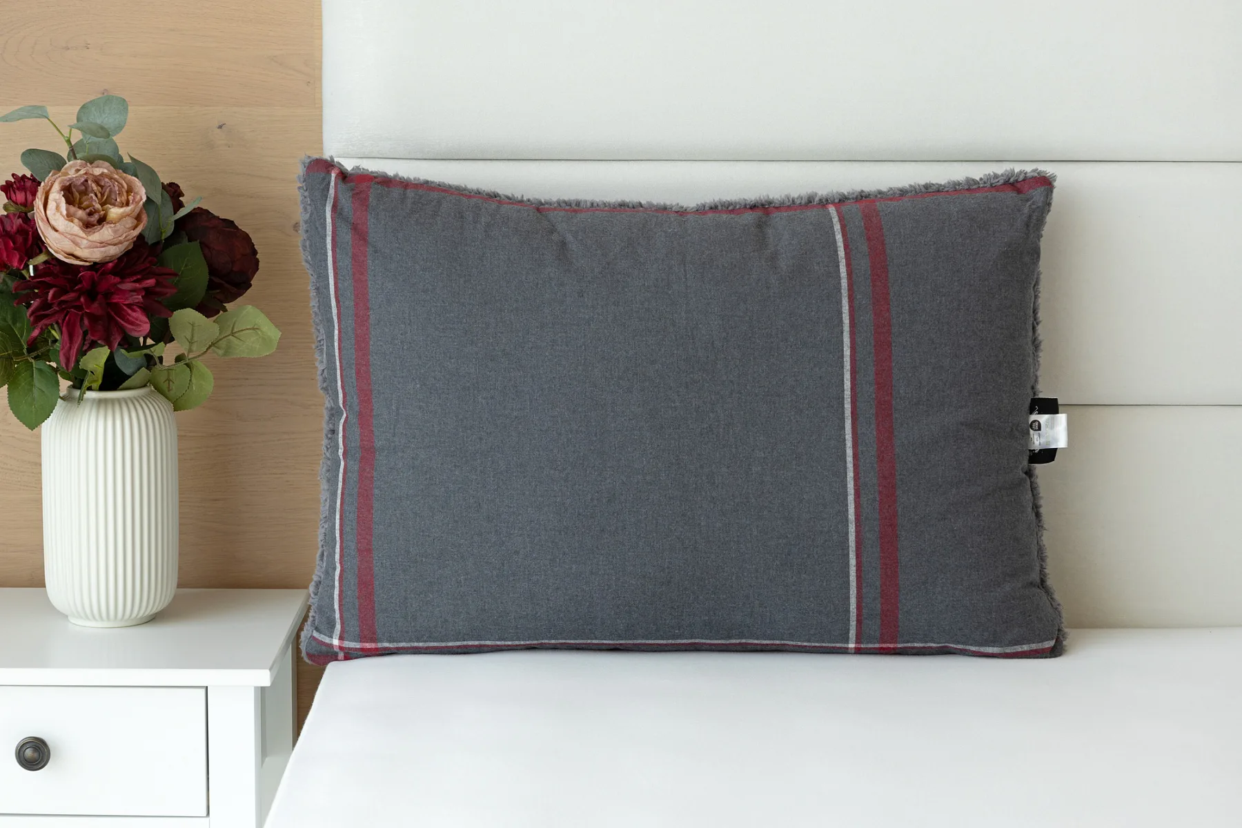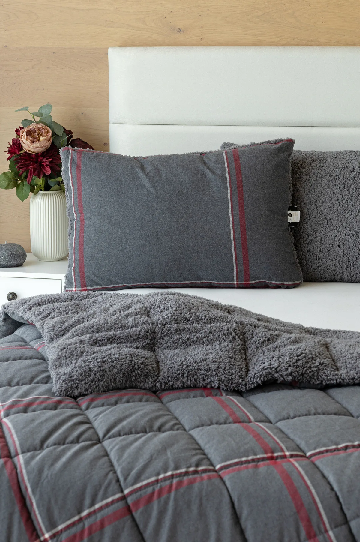 Atraktivní tmavě šedý podklad polštáře Ida protíná bílá a vínově červená linka, spodní stranu zdobí barevně sladěný beránek v tmavě šedém odstínu. K polštáři lze dokoupit také prošívanou přikrývku ve stejném designu.