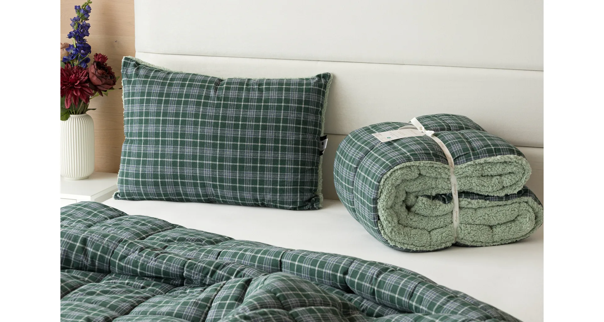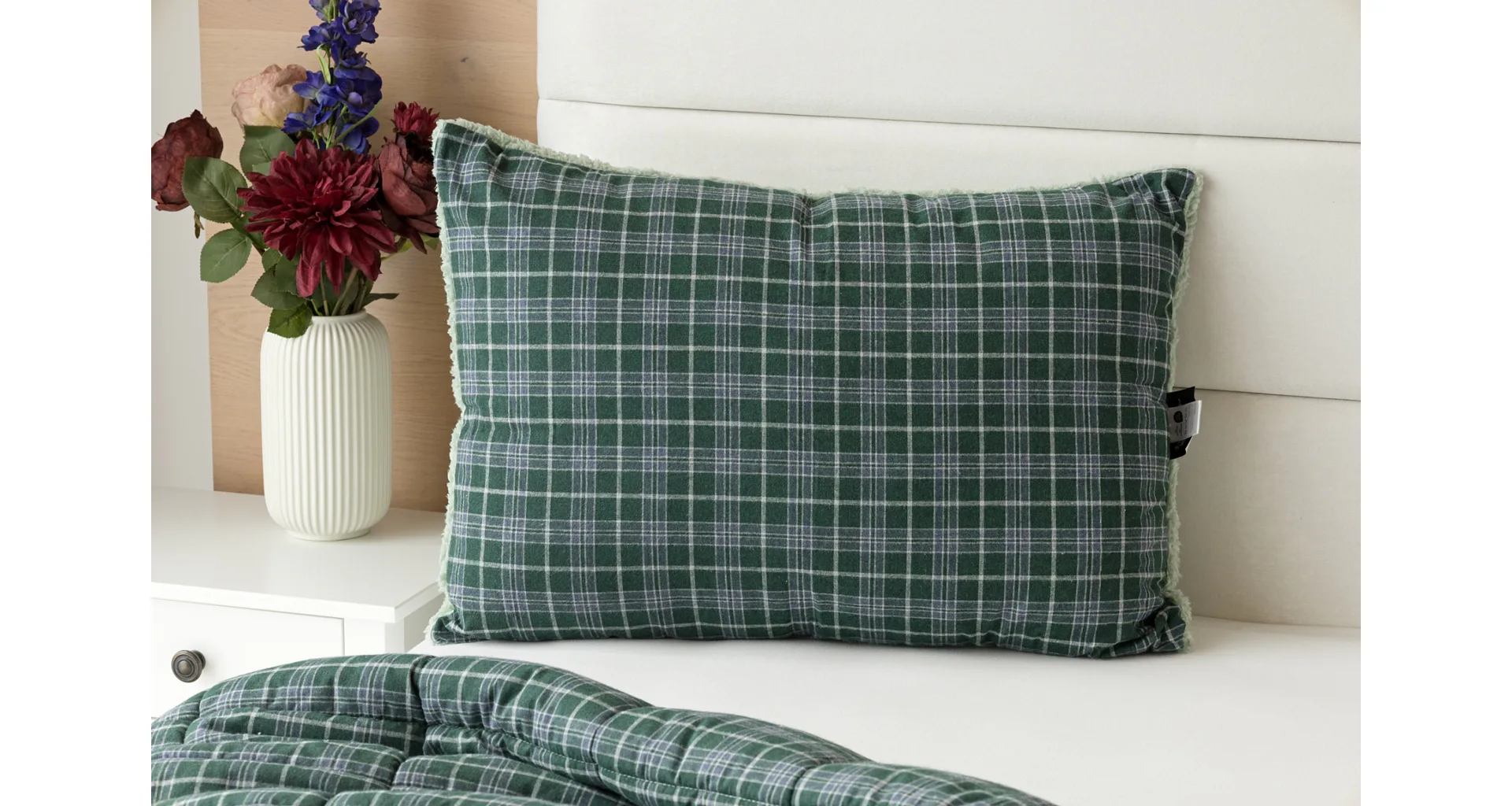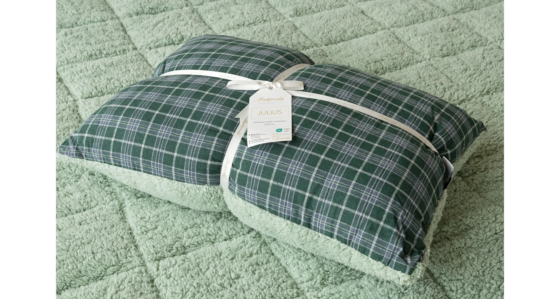 Atraktivní kostkovaný vzor Julius v paletě svátečních zelených a tlumených šedomodrých tónů doplňuje beránek světle zelené barvy. K polštáři lze dokoupit také prošívanou přikrývku ve stejném designu.