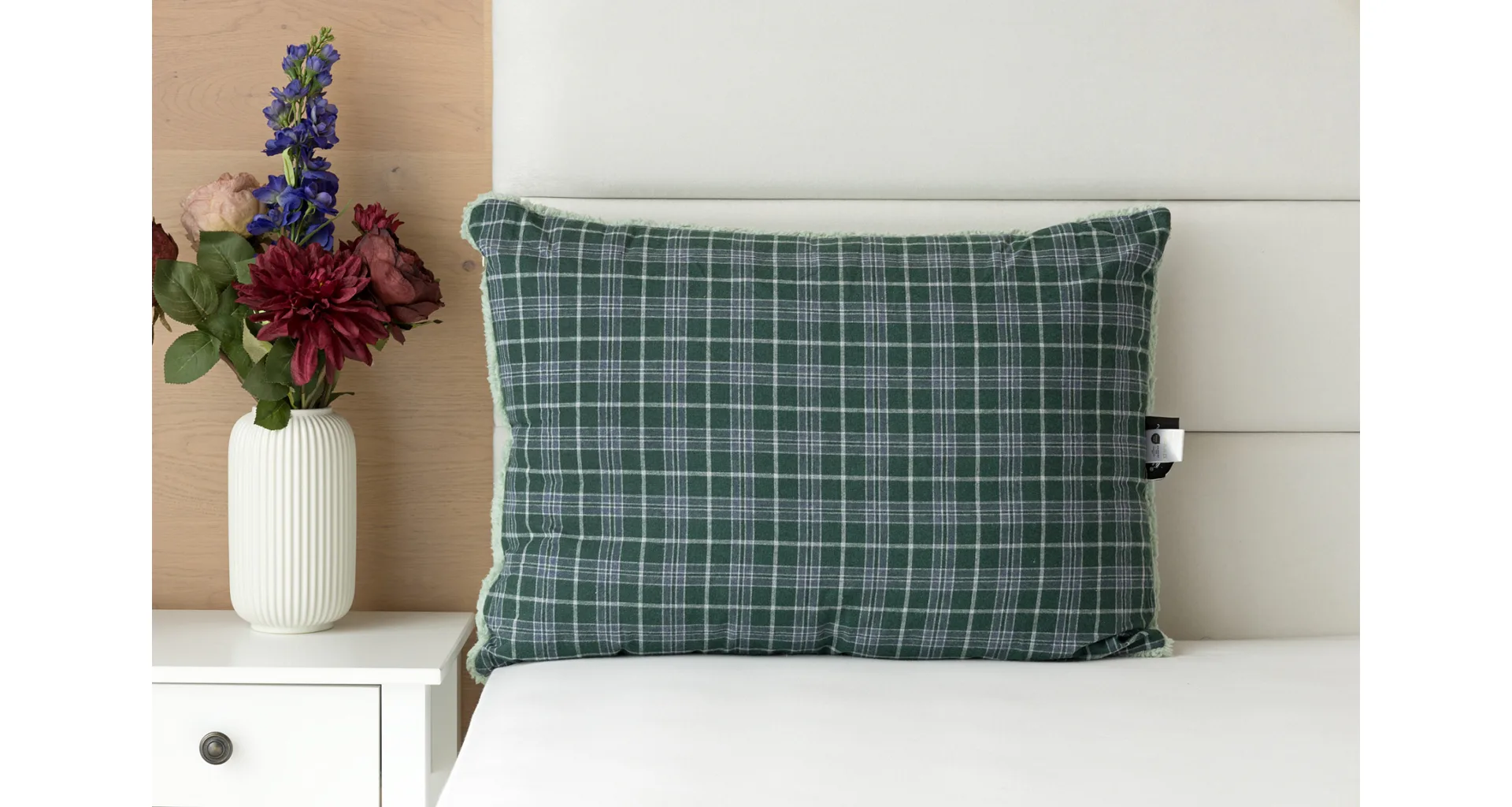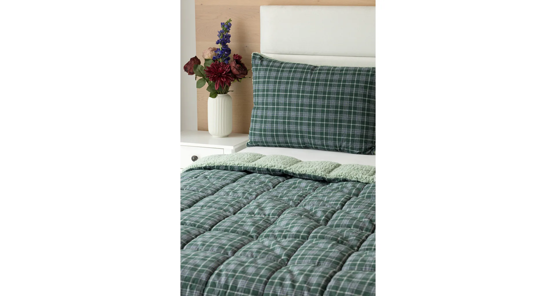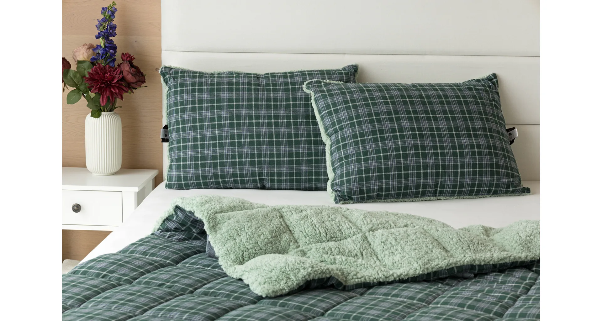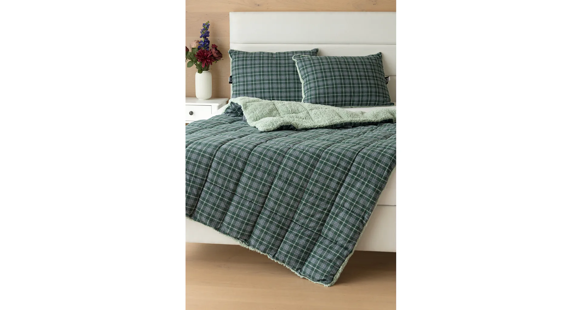 Atraktivní kostkovaný vzor Julius v paletě svátečních zelených a tlumených šedomodrých tónů doplňuje beránek světle zelené barvy. K polštáři lze dokoupit také prošívanou přikrývku ve stejném designu.