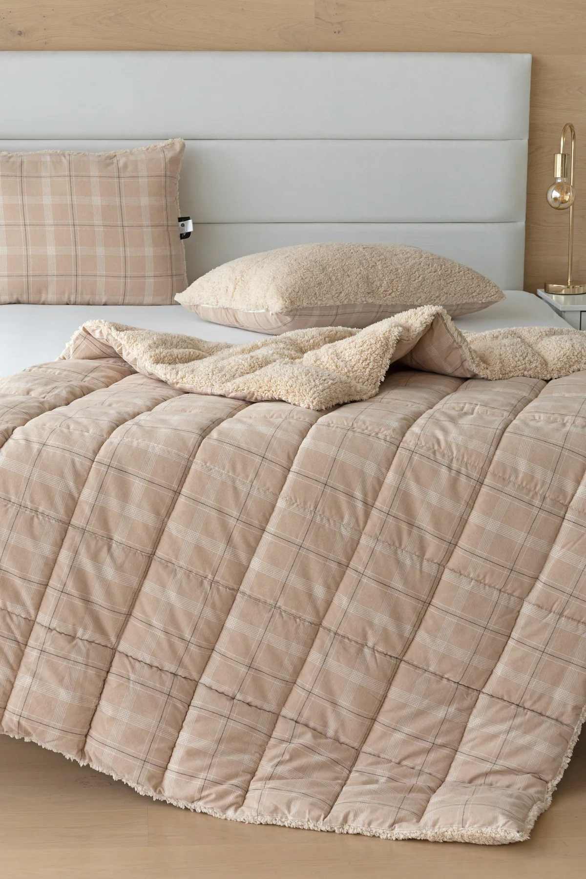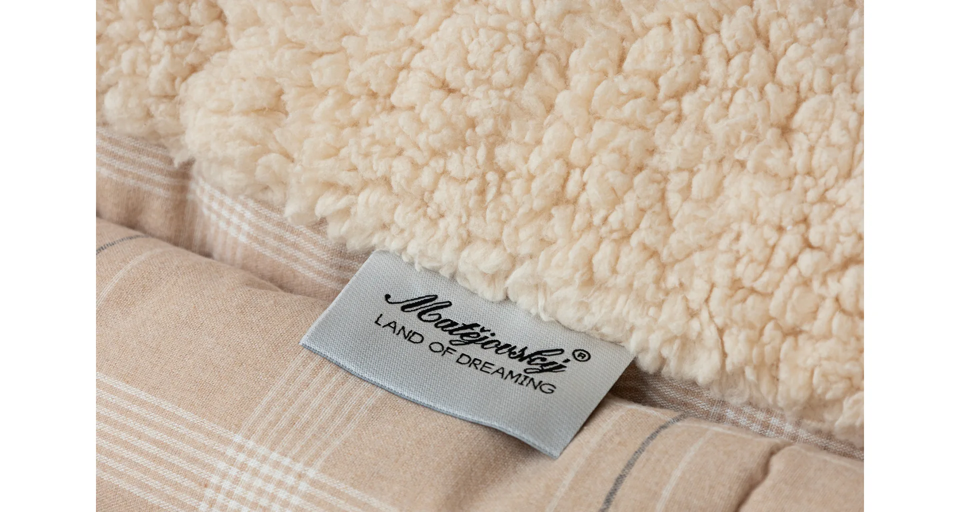 Vzor Leo s decentní kostkou v paletě béžových a krémových tónů doplňuje barevně sladěný beránek v béžovém odstínu. K polštáři lze dokoupit také prošívanou přikrývku ve stejném designu.