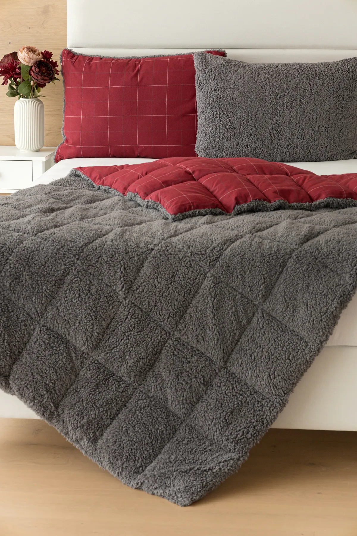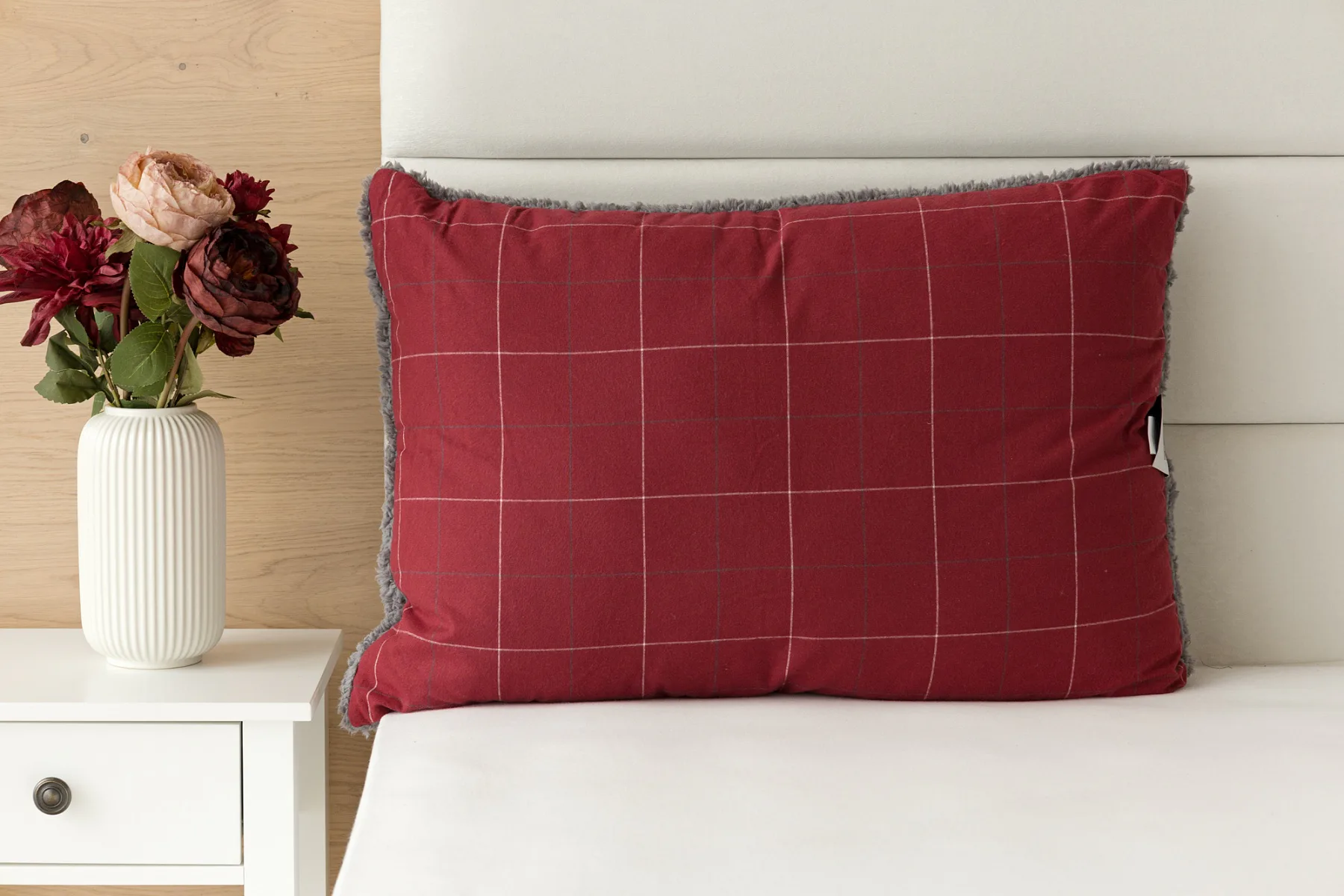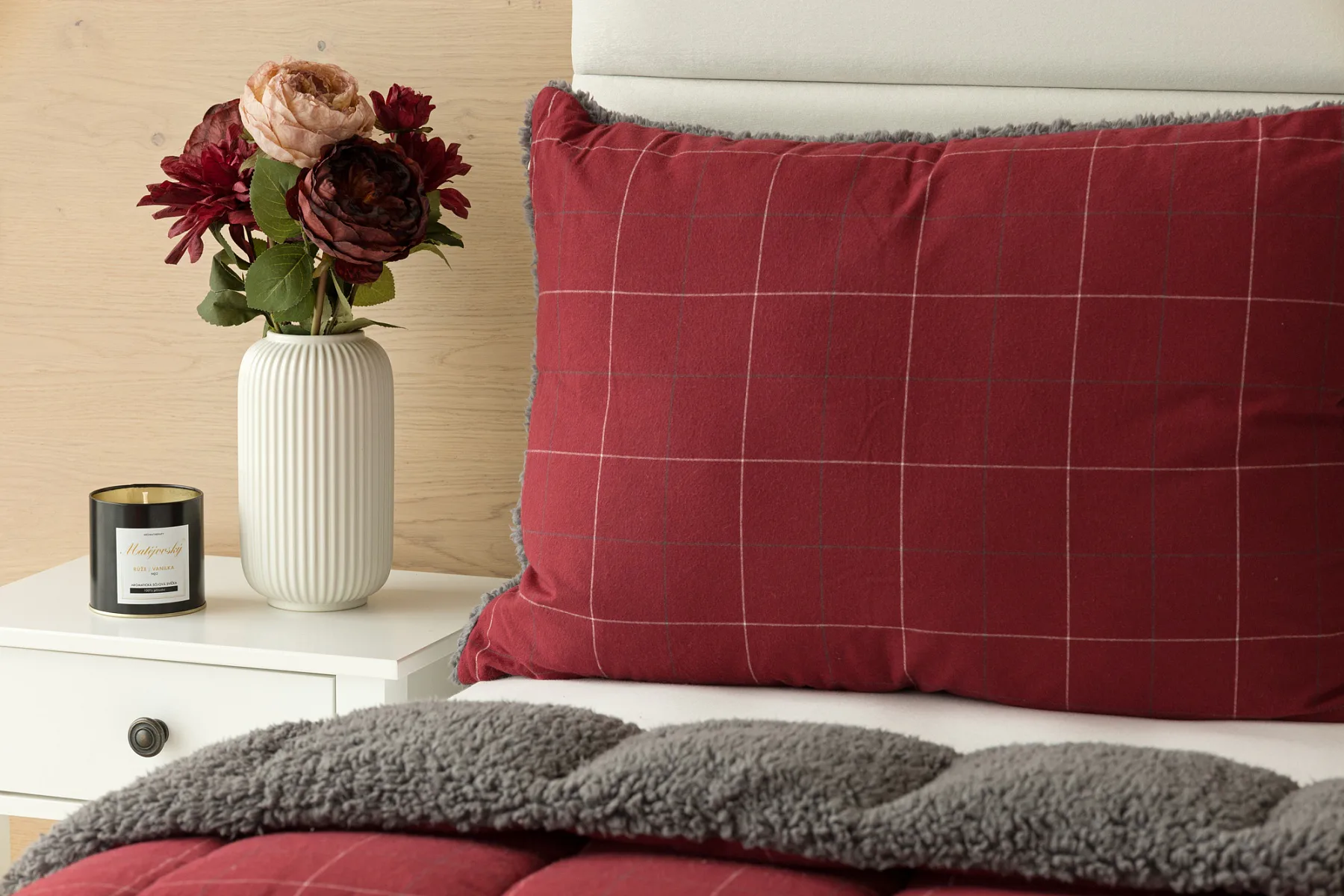 Vzor Linda ve sváteční červené barvě s jemným kostkovaným motivem doplňuje tmavě šedý beránek. K polštáři lze dokoupit také prošívanou přikrývku ve stejném designu.