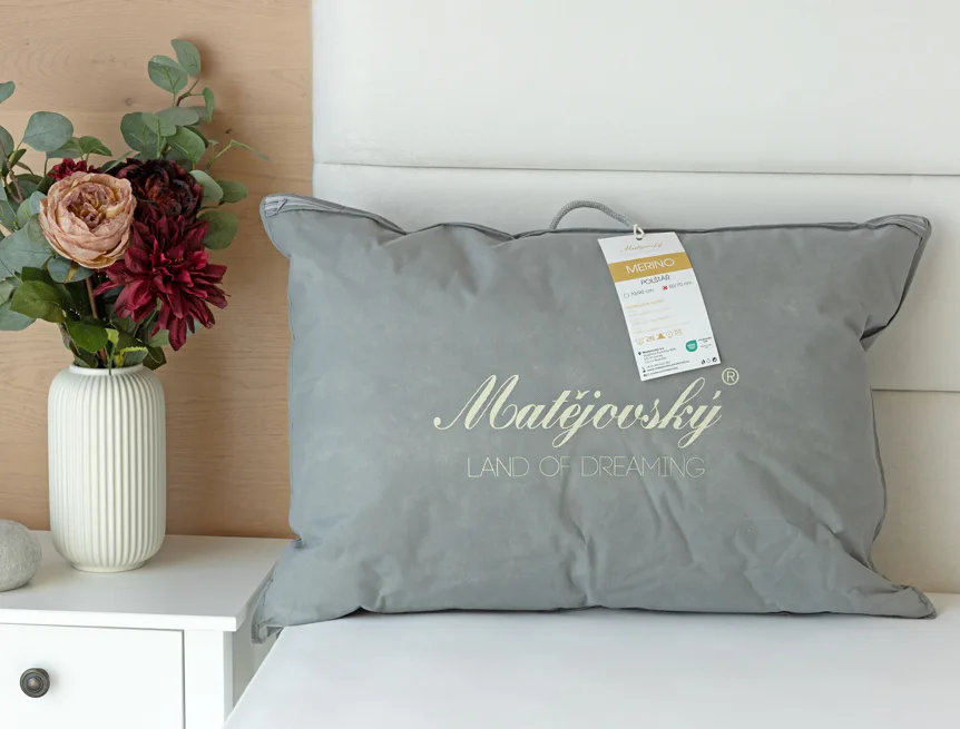 Balení: polštář z řady Merino je dodáván bez plastového obalu, v praktické tašce z netkané textilie